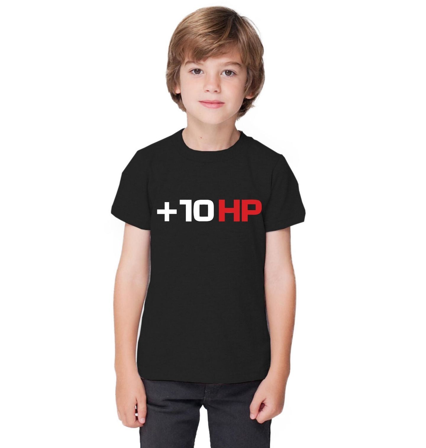 Dětské tričko +10 HP. Nečipuju. Neřeším turbo. Prostě si vezmu triko. +10 HP. HP (horsepower) označuje koňská síla – tedy výkon, který je pro každé auto klíčový. +10 HP není jen nápis – je to mindset. Pro všechny, co milují výkon, zvuk motoru a ten pocit, když víš, že by to ještě sneslo pár koní navíc.