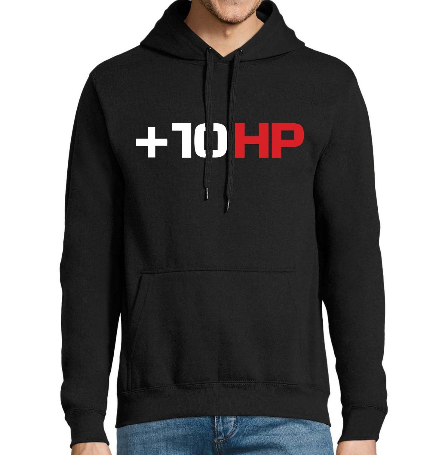 Pánská mikina +10 HP. Nečipuju. Neřeším turbo. Prostě si vezmu triko. +10 HP. HP (horsepower) označuje koňská síla – tedy výkon, který je pro každé auto klíčový. +10 HP není jen nápis – je to mindset. Pro všechny, co milují výkon, zvuk motoru a ten pocit, když víš, že by to ještě sneslo pár koní navíc.