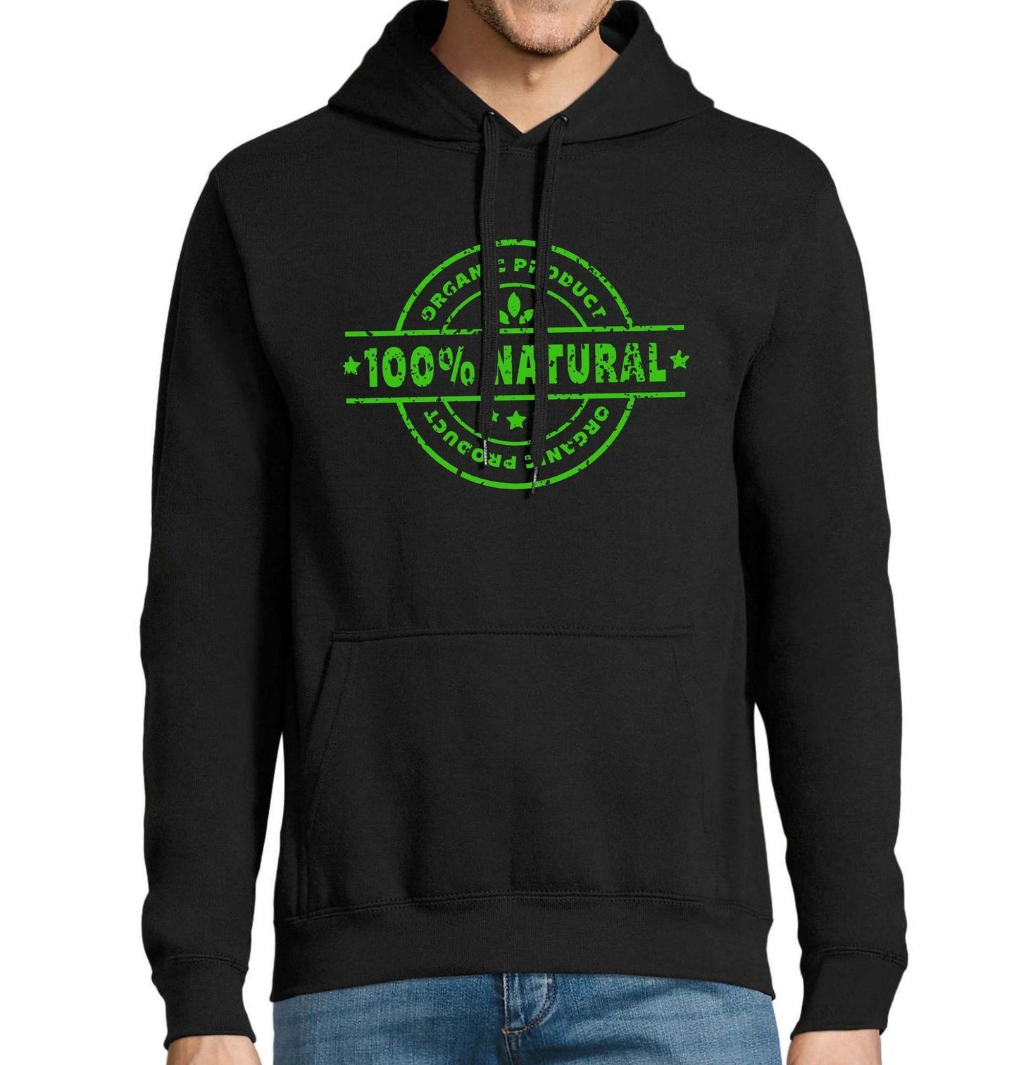 Pánská mikina 100% Přírodní produkt. Design připomíná vintage razítko s nápisy „100% Natural“ a „Organic Product“ v zelené barvě a obsahuje stylizovaný list, který podtrhuje spojení s přírodou. Ideální pro všechny milovníky udržitelnosti, veganství nebo bio stylu. Ideální vyjádření životního stylu založeného na ekologii a zdraví.