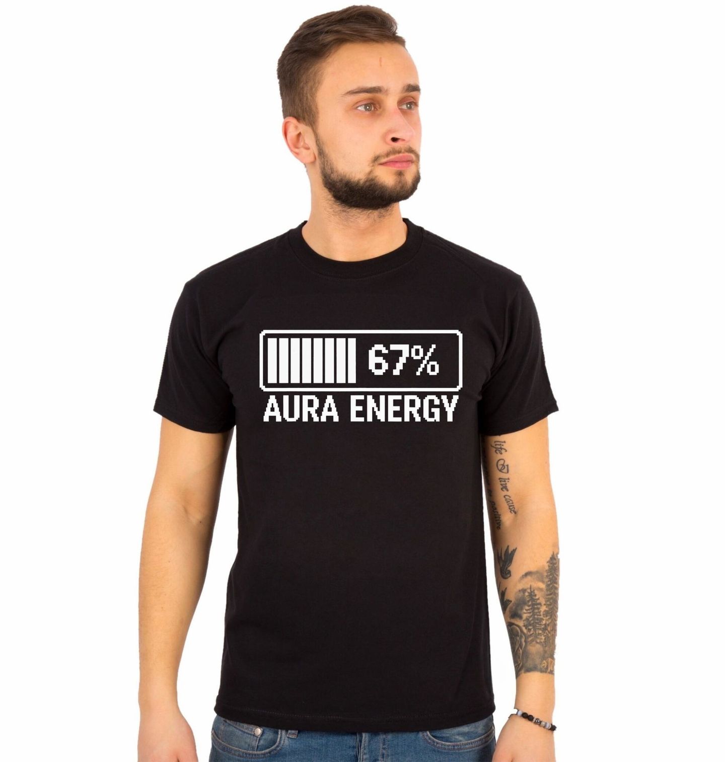Pánské tričko 67% Baterie Aura Energy. Design zobrazuje ikonickou baterii s nápisem AURA ENERGY 67%, která symbolizuje tvůj duševní výkon, náladu i memovou sílu. Číslo 67 odkazuje na virální meme, které v roce 2025 ovládlo TikTok a Instagram – symbol absurdní energie, která nikdy úplně nedojde, ale ani se nikdy nenabije na sto.