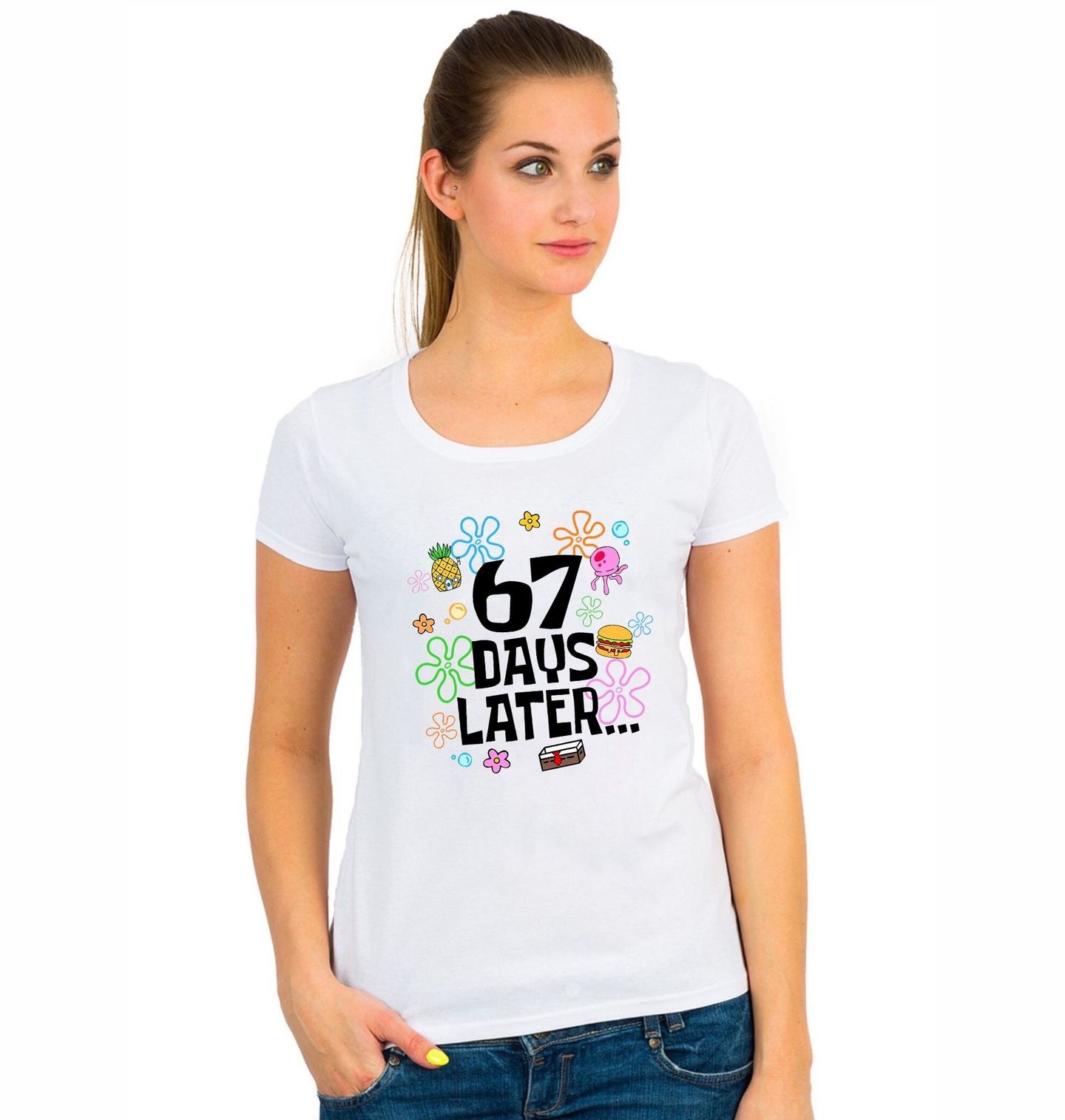 Dámské tričko 67 dní poté… Bublinkový přechod 67 Days Later Six Seven Meme. Stylizovaný motiv inspirovaný podmořským kresleným světem Bikini Bottom u SpongeBoba. Originální a vtipný meme motiv s nápisem 67 six seven a textem „67 dní poté…“, doplněný hravými mořskými obrázky, hamburgery a barevnými květinovými tvary.