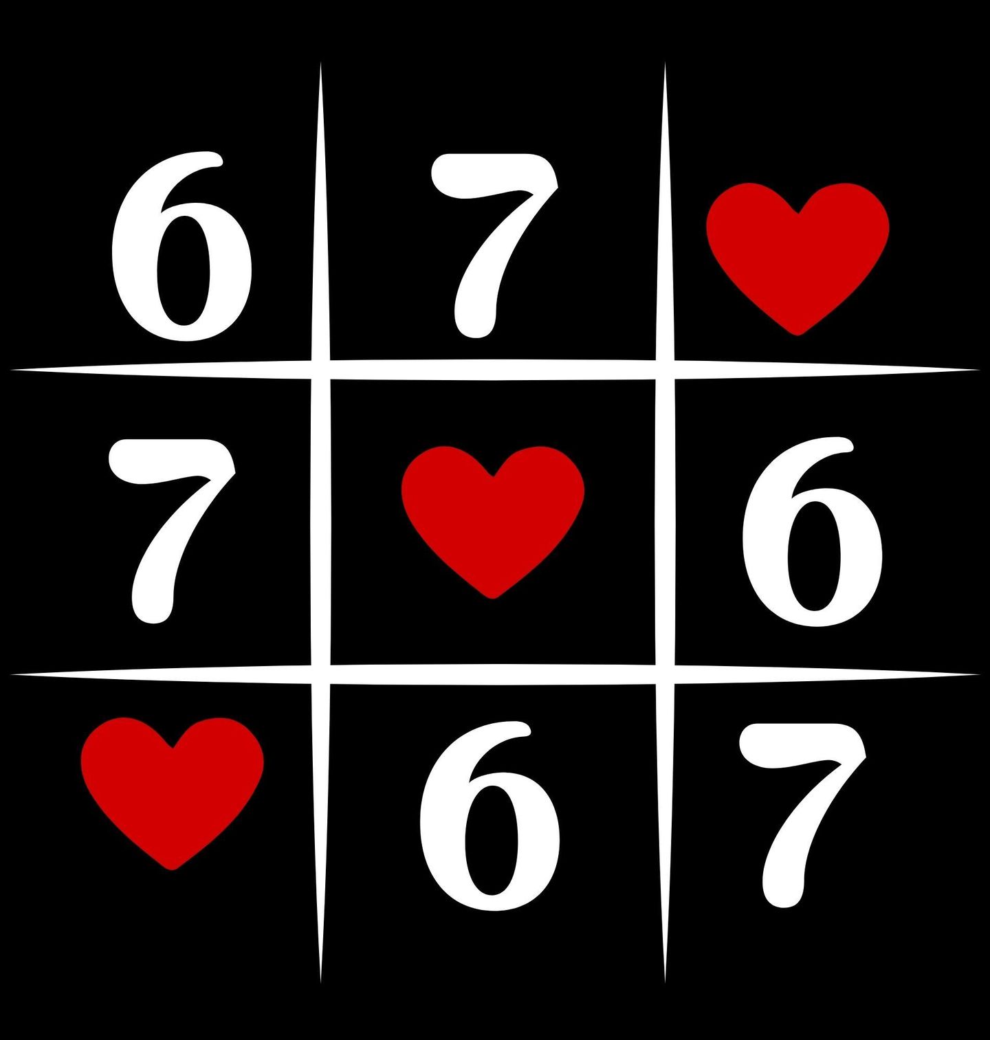 Dámské tričko 67 Piškvorky se Srdcem Six Seven. Stylový a hravý motiv 67 inspirovaný hrou piškvorky. V herní mřížce se střídají čísla six seven a červená srdce, díky čemuž vzniká zábavný a originální meme design. Motiv je ideální pro všechny, kdo mají rádi piškvorky, humor a číslo 67.