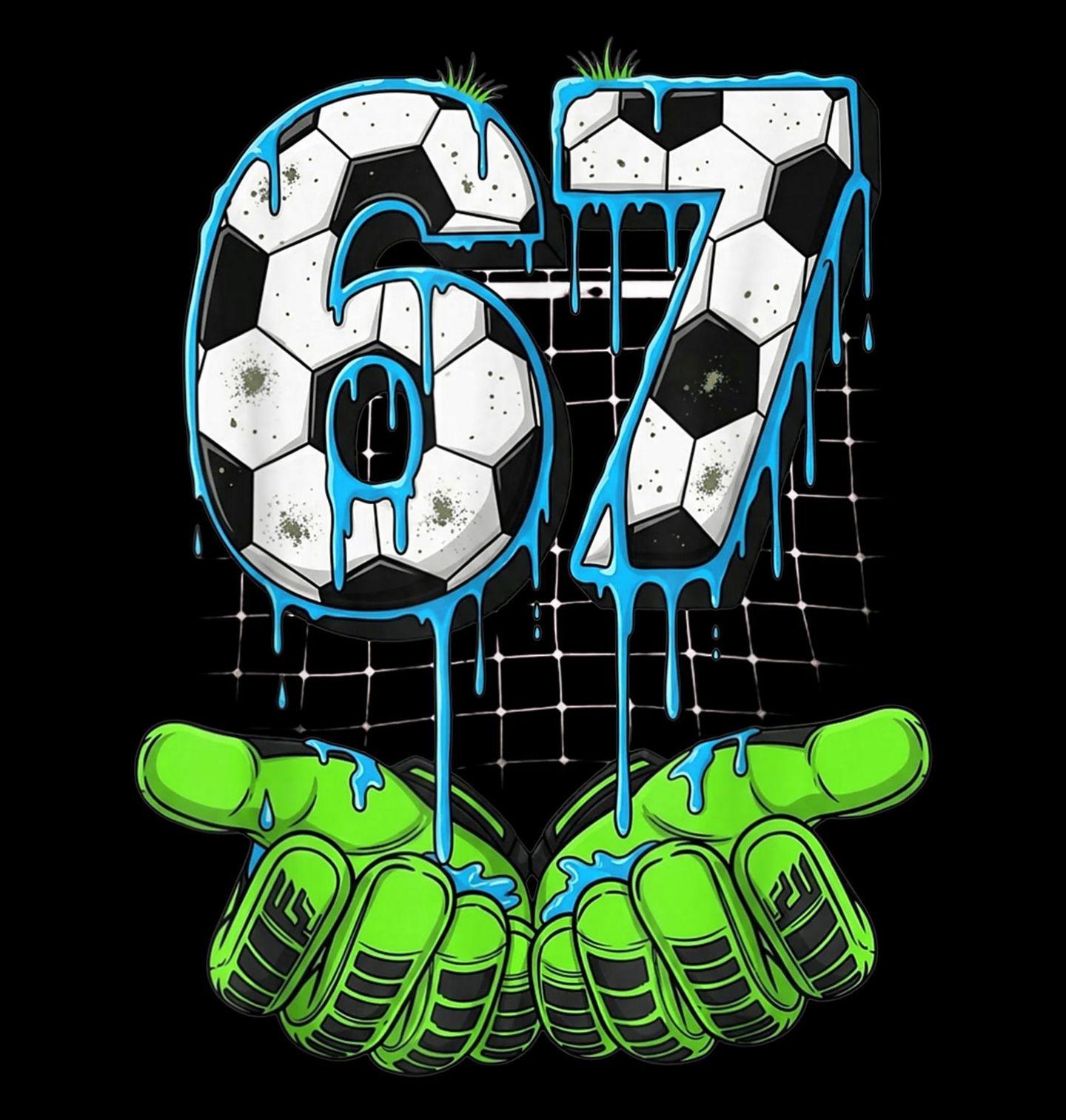 Dámské tričko 67 v Rukou Brankáře Six Seven. Na motivu je číslo 67, které je vytvořené ve stylu míčů na fotbal. V pozadí je fotbalová síť a dole jsou zelené brankářské rukavice, jako by číslo chytaly. Celý obrázek působí zábavně a lehce jako meme a odkazuje i na výraz six seven. Motiv je ideální pro všechny, kdo milují sport a číslo 67.