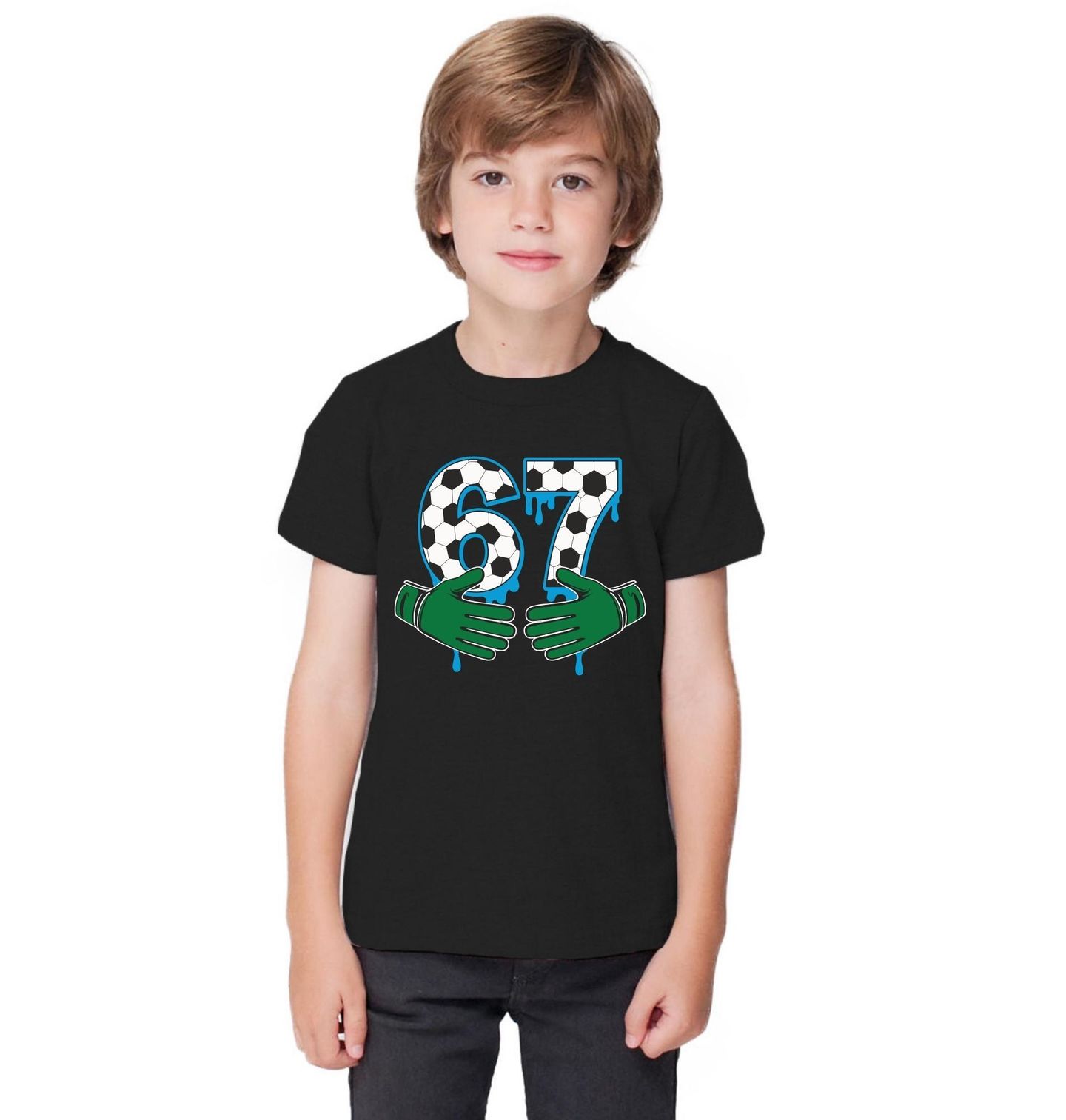 Dětské tričko 67 v Rukou Fotbalisty Six Seven. Na motivu je číslo 67, které je vyplněné vzorem fotbalového míče. Pod číslem jsou zelené brankářské rukavice, jako by 67 držely v rukou. Celý obrázek působí hravě jako meme a odkazuje i na pojem six seven. Jasný motiv pro všechny, kdo mají rádi fotbal a sport.