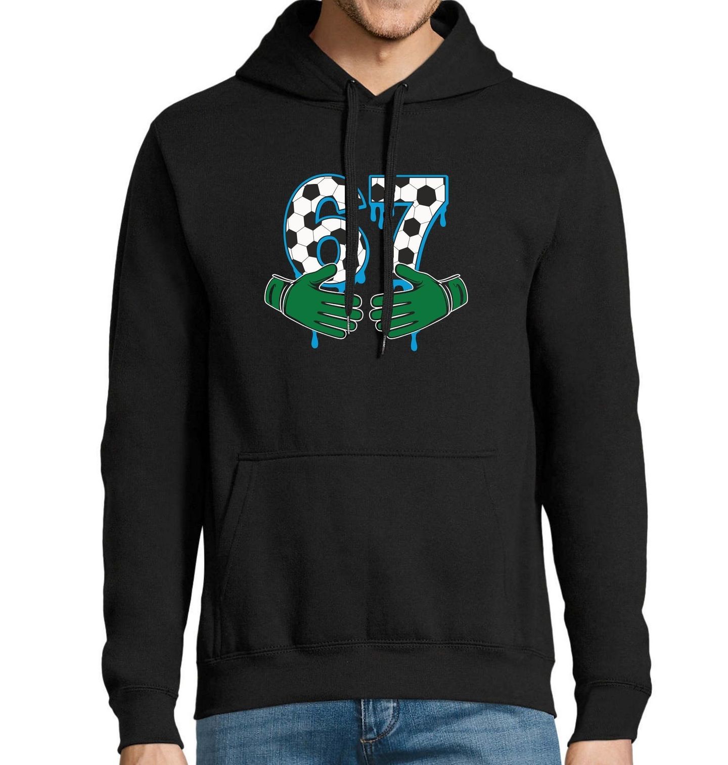 Pánská mikina 67 v Rukou Fotbalisty Six Seven. Na motivu je číslo 67, které je vyplněné vzorem fotbalového míče. Pod číslem jsou zelené brankářské rukavice, jako by 67 držely v rukou. Celý obrázek působí hravě jako meme a odkazuje i na pojem six seven. Jasný motiv pro všechny, kdo mají rádi fotbal a sport.