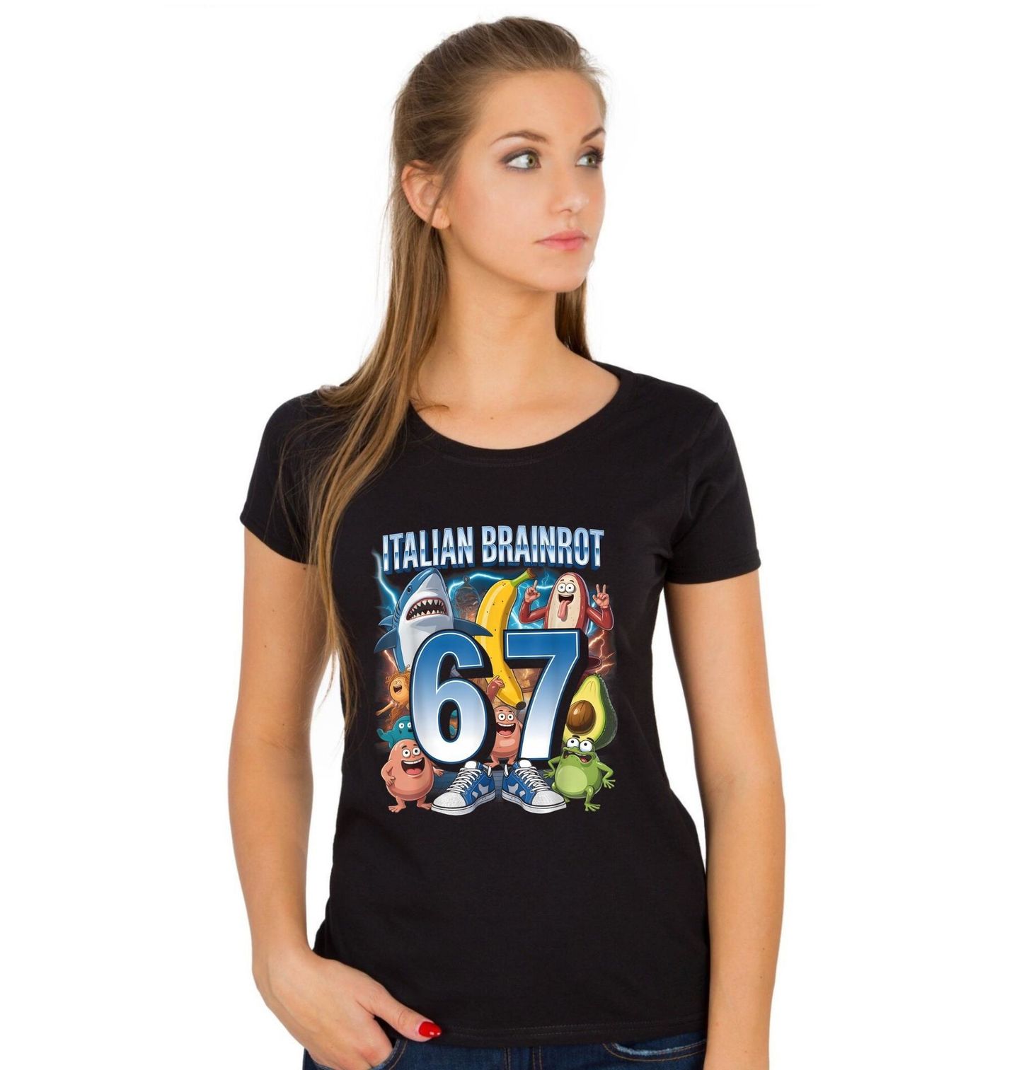 Dámské tričko 67 v Teniskách Six Seven Italian Brainrot. Tohle je čistý italsky brainrot v té nejvtipnější podobě! Velké číslo 67 doplňuje barevná banda šílených postaviček – žralok, banán, avokádo, fazole a další blázniví kámoši, kteří vypadají jako živé meme. A samozřejmě nechybí ani nápis six seven, takže je hned jasné, o jakou legendu jde.