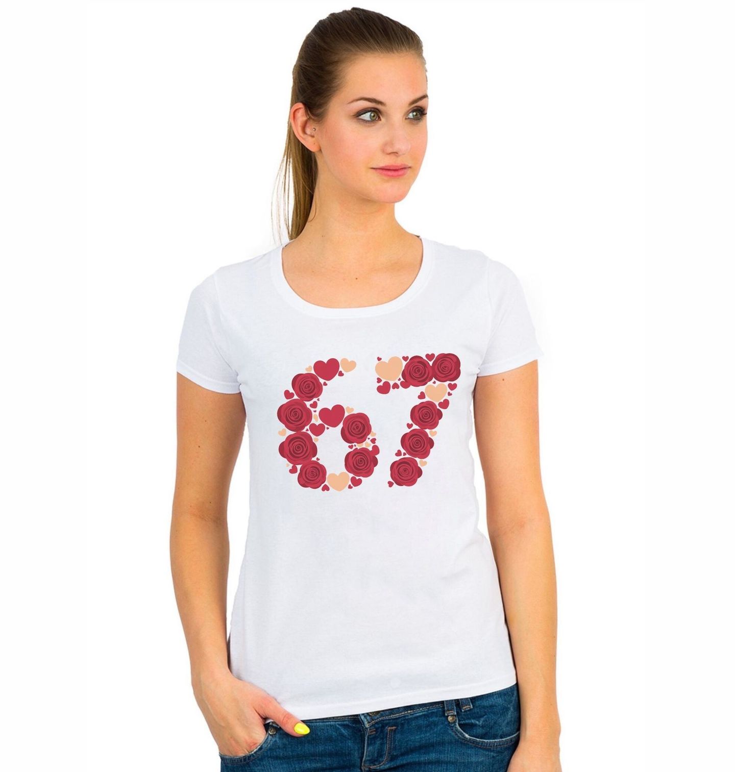 Dámské tričko 67 z Růží Six Seven Meme. Elegantní a něžný motiv, ve kterém je číslo 67 vytvořeno z krásných růží a srdíček. Design six seven v romantickém stylu s jemným meme podtónem je ideální pro všechny, kteří milují lásku, růže a srdce. Ideální na Valentýna, výročí, narozeniny nebo jen tak pro radost. Pokud hledáš něco originálního, romantického a zároveň hravého, tenhle meme růže design je přesně ono.