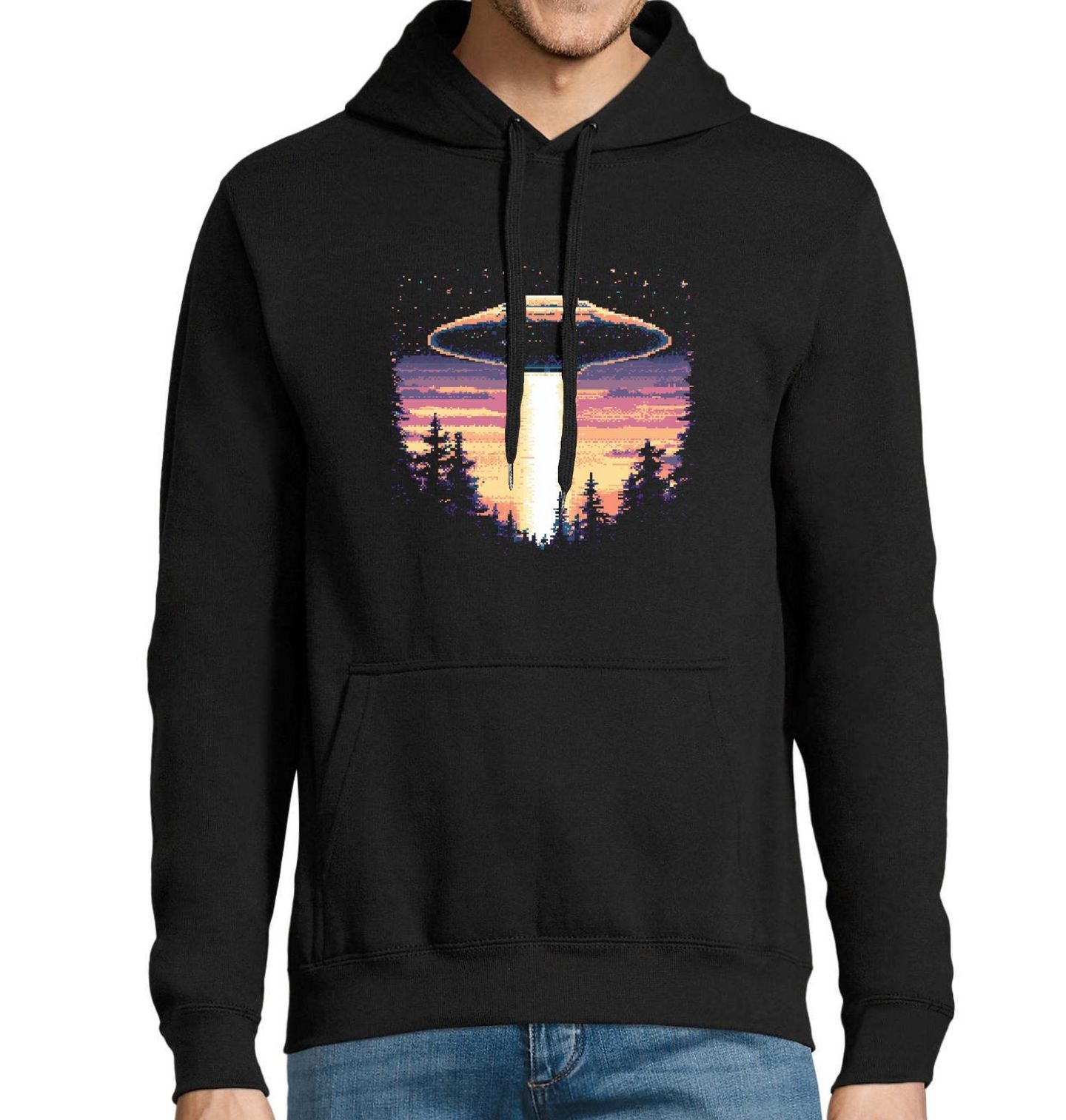 Pánská mikina 8bit Přílet Mimozemšťanů Pixalated UFO. Mimozemšťané v lese přináší retro pixelartový motiv, který zobrazuje tajemné UFO, jak se vznáší nad temným lesem za barevného západu slunce. Design v 8bitovém stylu připomíná atmosféru klasických videoher a sci-fi filmů 80. a 90. let. Ideální pro fanoušky vesmíru, záhad, mimozemšťanů, retro her a pixelové estetiky.