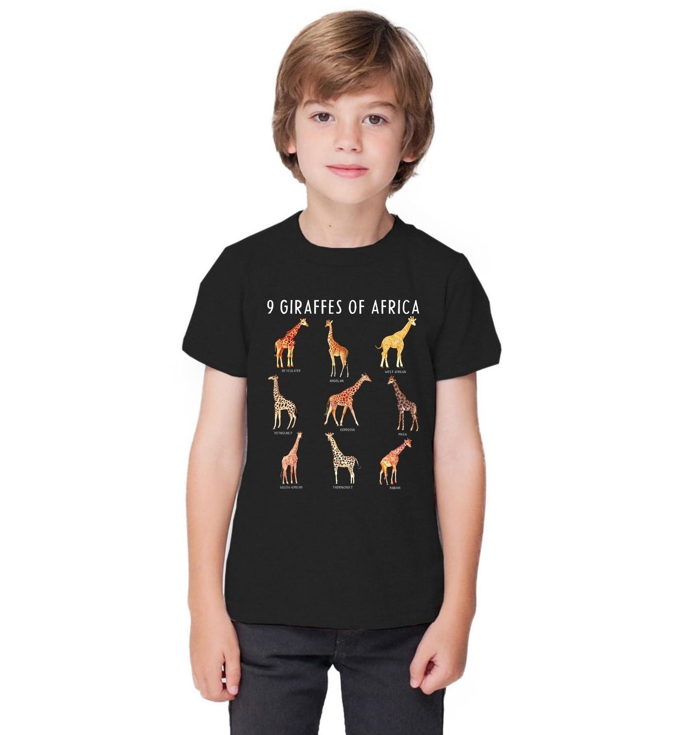 Dětské tričko 9 Druhů Žiraf z Afriky 9 Giraffes of Africa. Tento originální motiv potěší všechny milovníky zvířat i Afriky. Na obrázku je krásně ilustrovaná žirafa v devíti různých poddruzích, které žijí na africkém kontinentu. Každá žirafa má svůj typický vzor srsti i barvu. Na motivu jsou tyto druhy žiraf: Reticulated, Angolan, West African, Rothschild, Kordofan, Masai, South African, Thornicroft, Nubian.