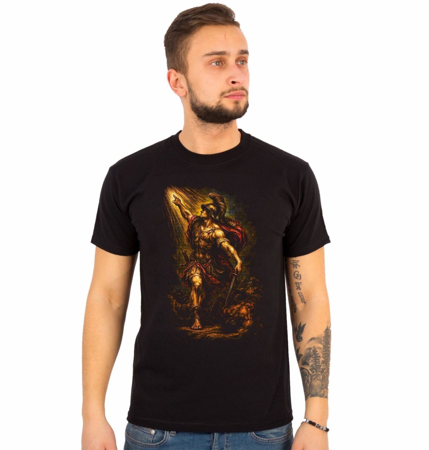 Pánské tričko Achilles Hrdina Tróje. Řecká mytologie z něj udělala symbol dokonalého válečníka – rychlého, neústupného a téměř nezranitelného hrdiny trojské války. Paprsek světla nad jeho vztyčenou rukou podtrhuje osudovost okamžiku, zatímco poražený nepřítel u nohou připomíná, že Achilleus byl postrachem bojiště. Achilleus byl nejsilnější a nejrychlejší válečník řeckého vojska. Když bojoval, Trójané ustupovali.