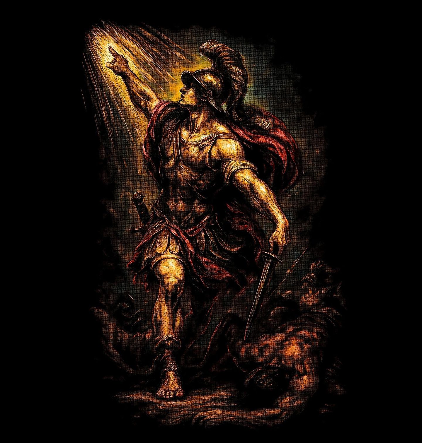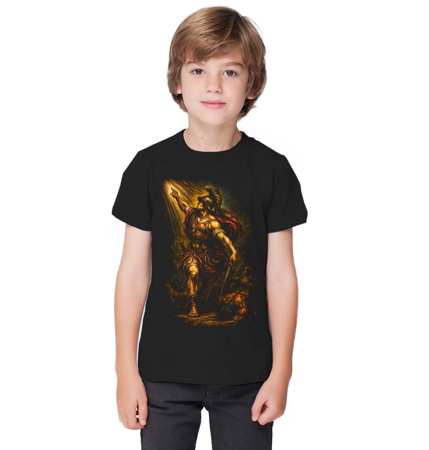 Dětské tričko Achilles Hrdina Tróje. Řecká mytologie z něj udělala symbol dokonalého válečníka – rychlého, neústupného a téměř nezranitelného hrdiny trojské války. Paprsek světla nad jeho vztyčenou rukou podtrhuje osudovost okamžiku, zatímco poražený nepřítel u nohou připomíná, že Achilleus byl postrachem bojiště. Achilleus byl nejsilnější a nejrychlejší válečník řeckého vojska. Když bojoval, Trójané ustupovali.