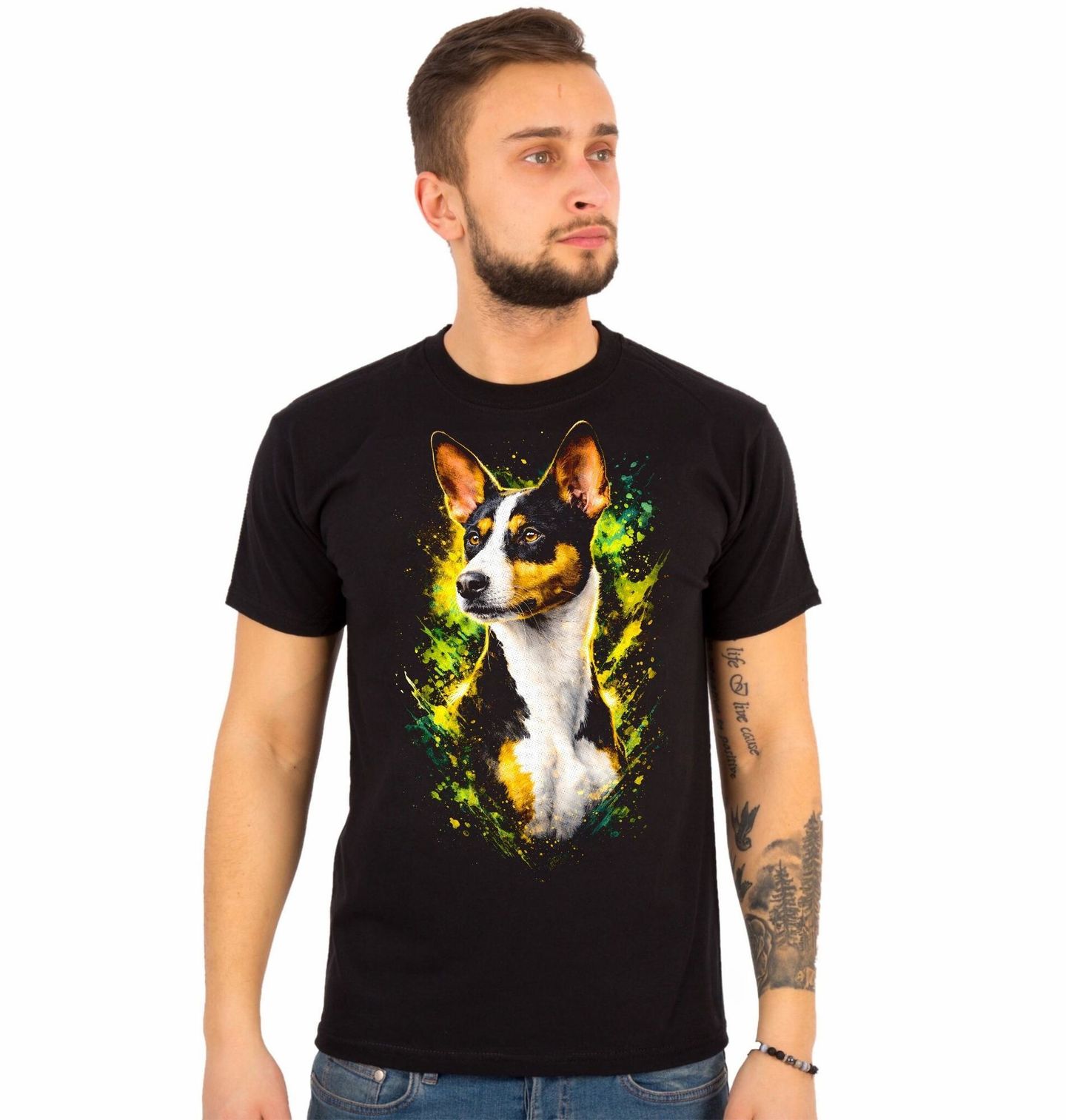 Pánské tričko Africký Basenji. Tento výrazný motiv zachycuje plemeno Basenji, které je známé svou elegancí, bystrým pohledem a typickými vztyčenými ušima. Tento jedinečný pes pochází z Afriky a je známý tím, že téměř neštěká, ale vydává specifické zvuky připomínající jódlování. Každý pejskař, který má rád originální a inteligentní plemena, ocení jeho nezávislou povahu a energii.