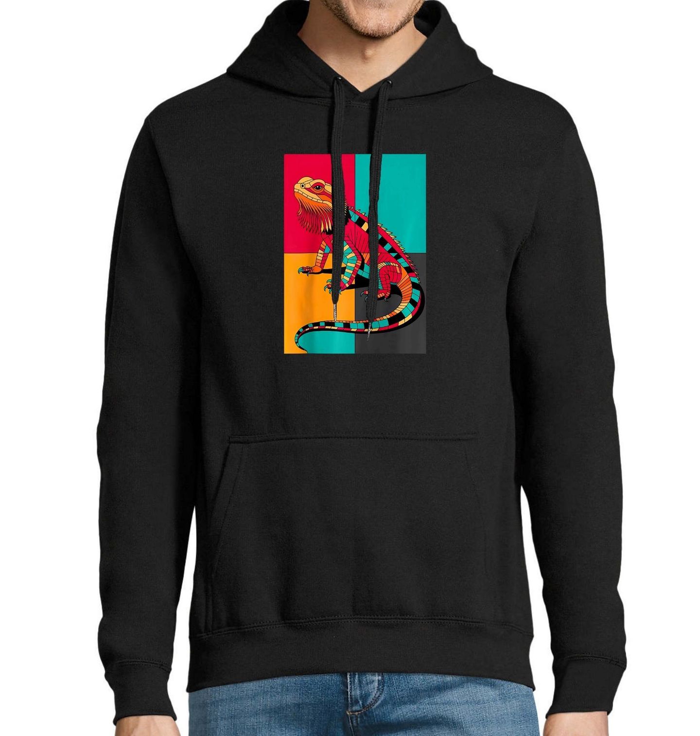 Pánská mikina Agama Vousatá Bearded Dragon. Originální tričko s motivem agamy vousaté v zářivém retro pop-art provedení. Agama australská je oblíbený ještěr známý svou klidnou povahou a charakteristickým „vouskem“. Tento barevný a stylový design zaujme každého milovníka plazů, retro módy i netradičních grafik.