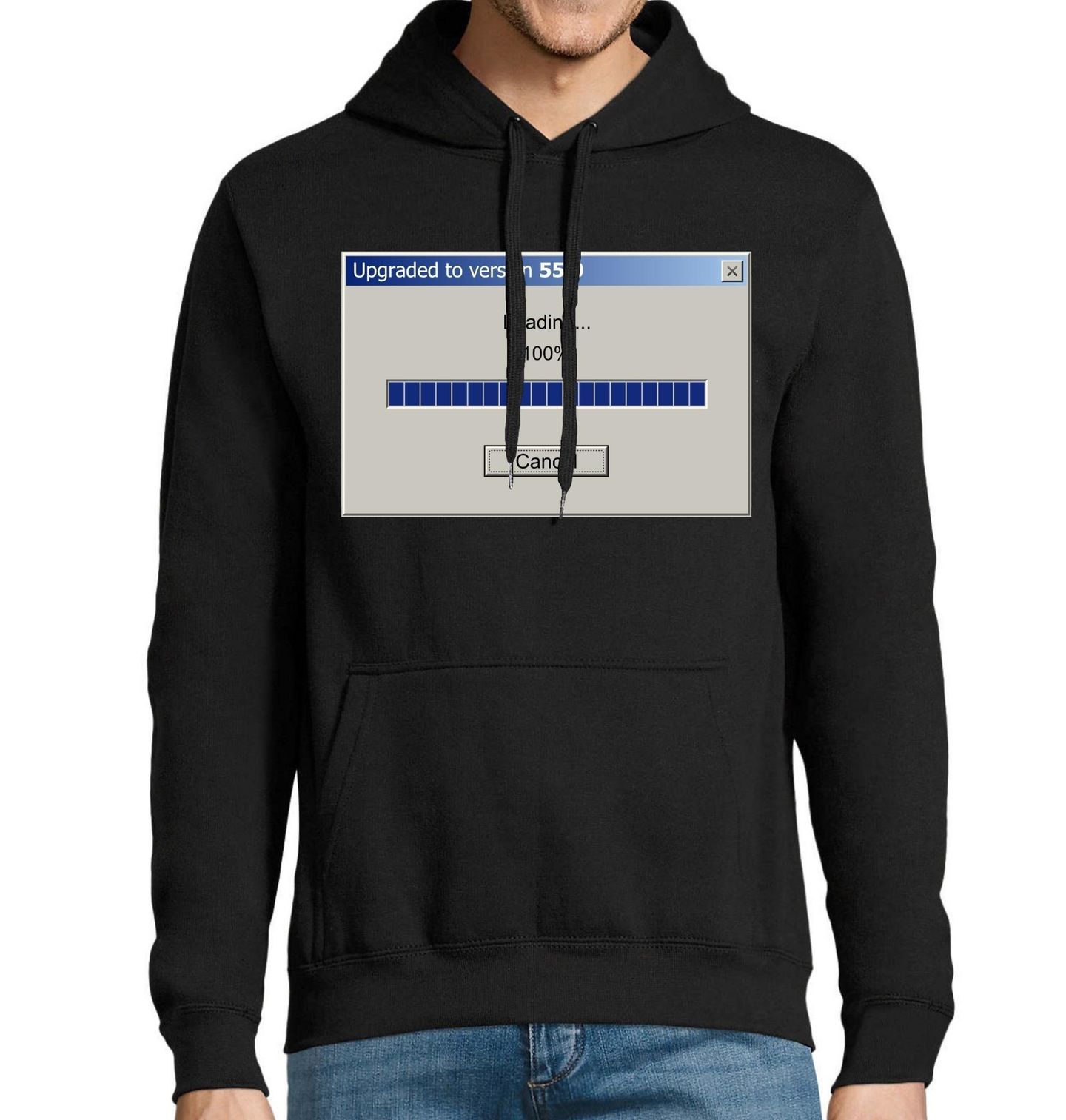 Pánská mikina Aktualizováno na verzi 55.0. Originální motiv Upgraded to Version 55.0 je skvělou volbou pro každého, kdo slaví 55. narozeniny s humorem. Design připomíná staré počítačové načítací okno ve stylu klasických XP Windows, takže skvěle zaujme všechny fanoušky retro techniky, IT humoru a počítačové estetiky.