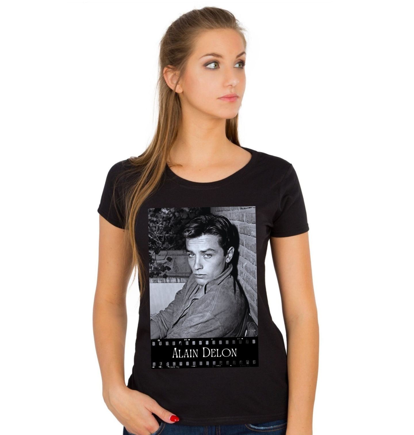 Dámské tričko Alain Delon. Alain Delon byl francouzský herec známý svým charismatem, výrazným pohledem a nezaměnitelným stylem. Proslavil se rolemi ve filmech jako Samuraj, Rocco a jeho bratři nebo Borsalino, díky kterým se stal symbolem elegance a mužnosti. Tento motiv zachycuje jeho ikonický vzhled v minimalistickém filmovém stylu, který ocení milovníci klasického filmu, hereckých legend i nadčasového designu.