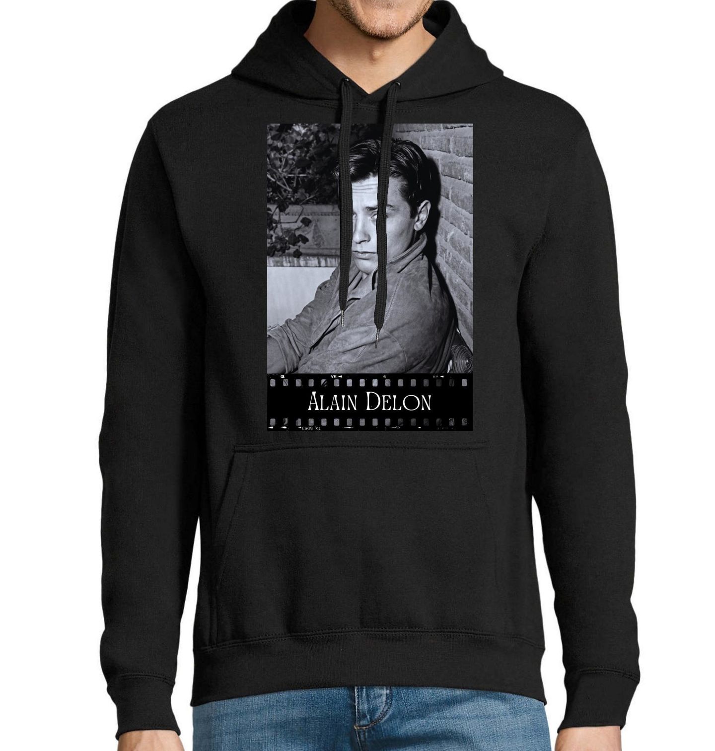 Pánská mikina Alain Delon. Alain Delon byl francouzský herec známý svým charismatem, výrazným pohledem a nezaměnitelným stylem. Proslavil se rolemi ve filmech jako Samuraj, Rocco a jeho bratři nebo Borsalino, díky kterým se stal symbolem elegance a mužnosti. Tento motiv zachycuje jeho ikonický vzhled v minimalistickém filmovém stylu, který ocení milovníci klasického filmu, hereckých legend i nadčasového designu.