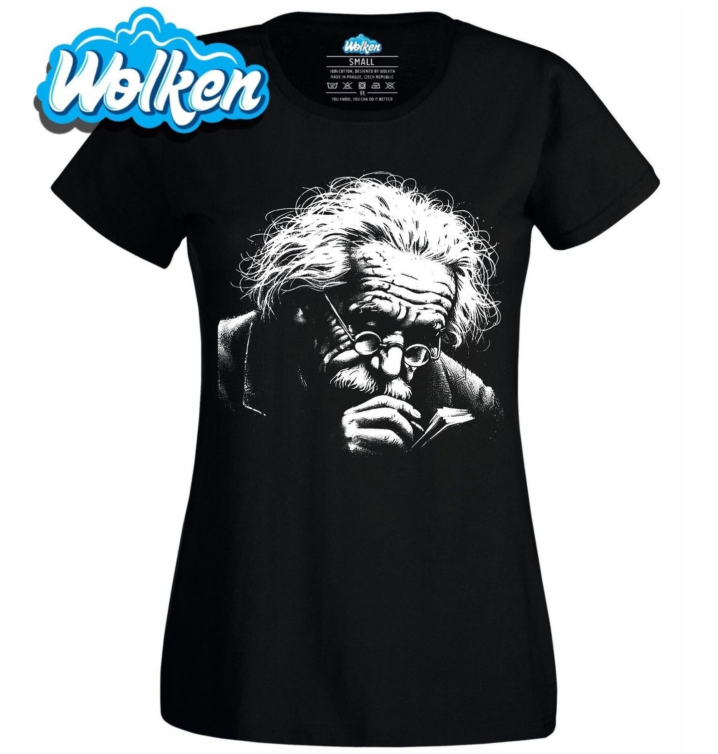 Dámské tričko Albert Einstein při Práci. Černobílý umělecký motiv ukazuje Einsteina, jak čte, přemýšlí a doslova se noří do světa myšlenek. Není to Einstein v laboratoři, ale Einstein s knihou – plný hloubky, pokory a intelektu. Tento motiv ocení všichni, kdo vědí, že pravá síla není v hluku, ale v myšlení.
