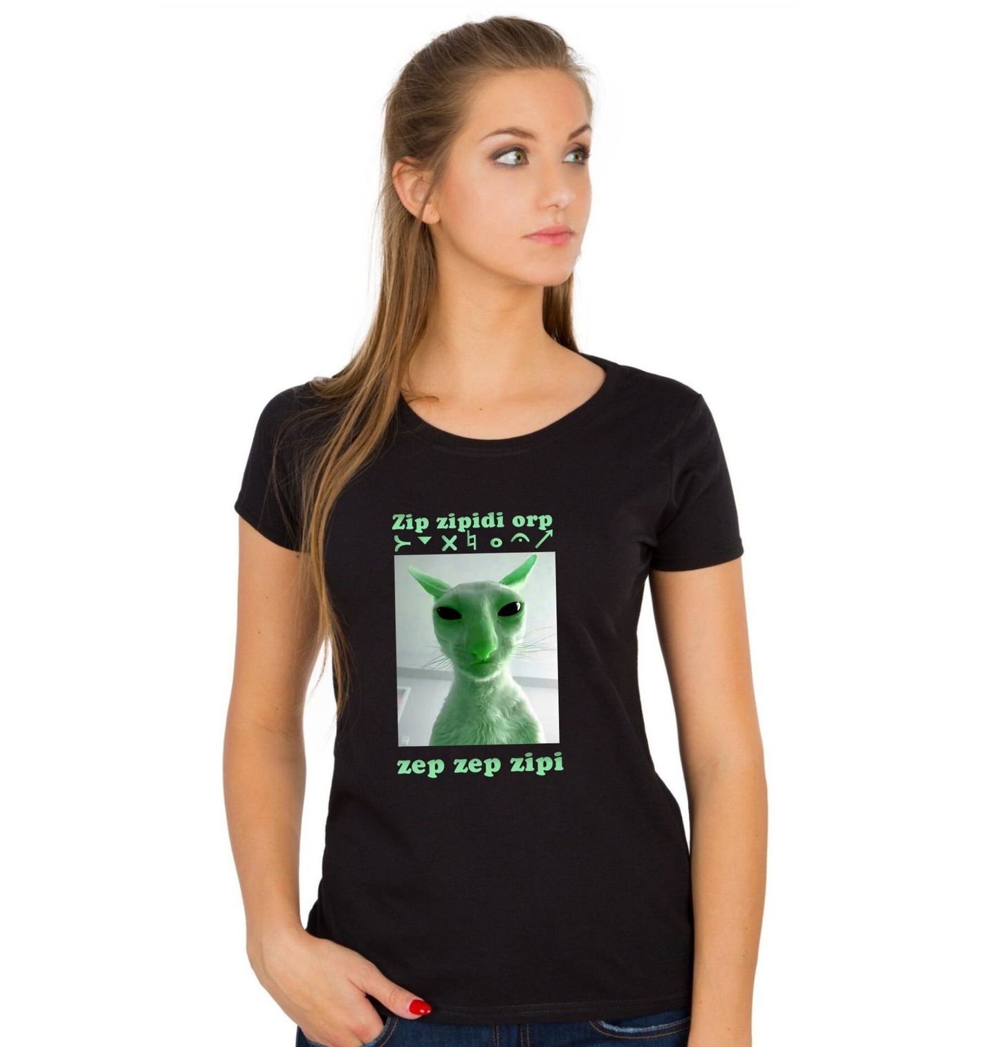 Dámské tričko Alien Kočka Meme Gnarp Gnarp. Tento originální motiv spojuje dvě internetové klasiky — meme a kočky. Zelená mimozemská kočka s obříma očima působí legračně i trochu záhadně a doplňuje ji nápis „Zip zipidi orp“ a dole výraz „zep zep zipi“, které dodávají designu ještě víc mimozemské atmosféry.
