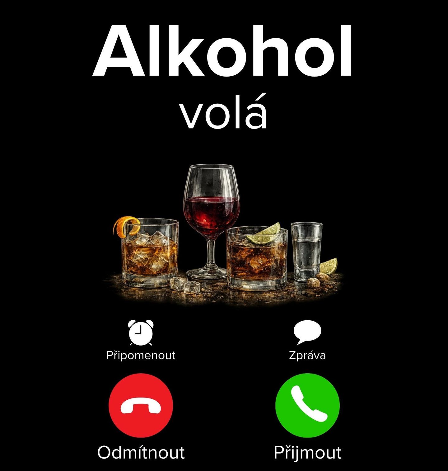 Pánská mikina Alkohol volá Phone Call. Stylový a vtipný motiv pro všechny, kteří vědí, že když alkohol volá, je čas odložit starosti a užít si večer. Grafika inspirovaná příchozím hovorem v kombinaci se sklenkami dává jasný signál – párty začíná právě teď. Tento motiv pobaví okolí a perfektně vystihne náladu každé pořádné párty.