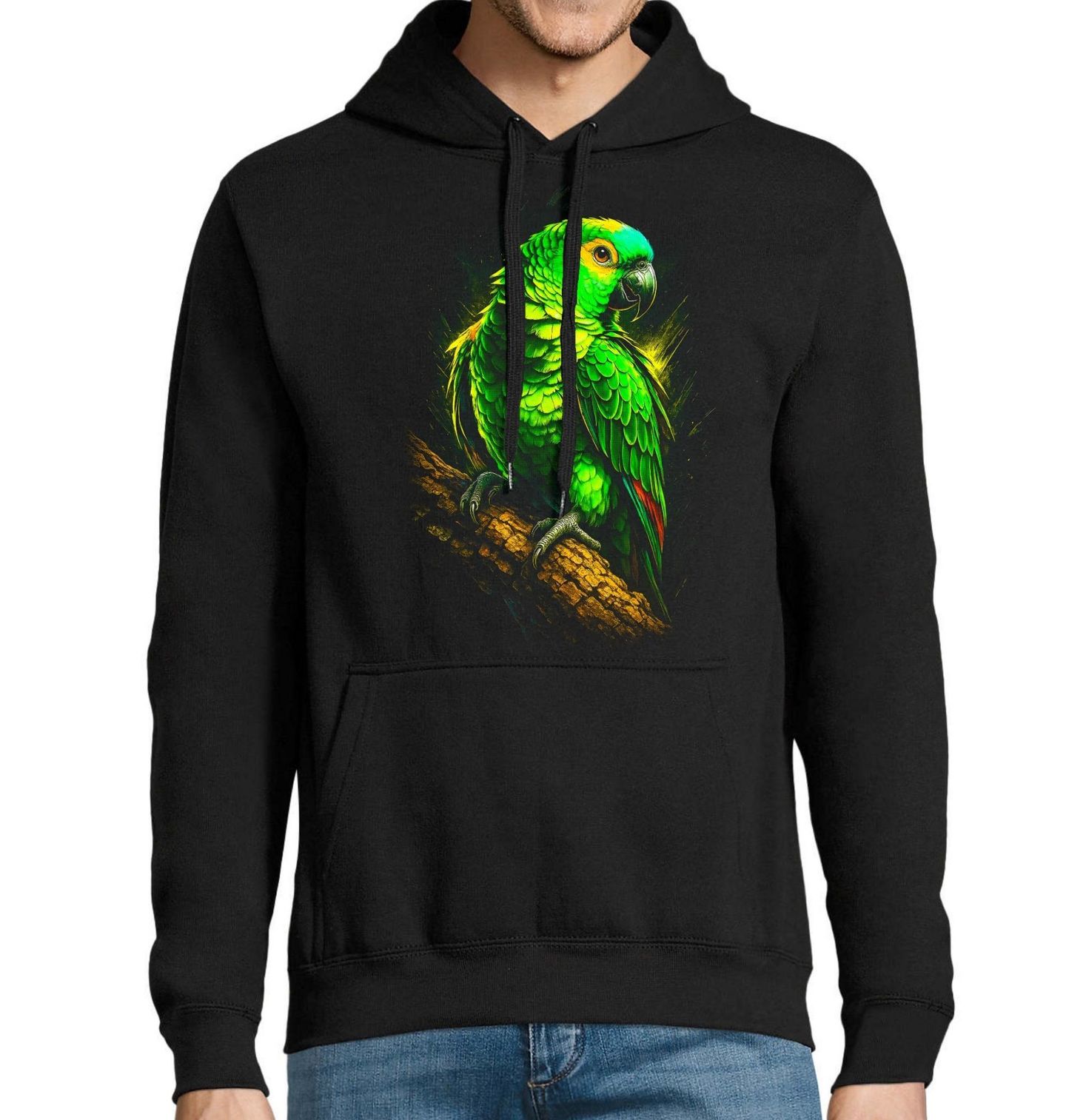 Pánská mikina Amazoňan zelený. Exotický papoušek v podobě majestátního amazoňana, jednoho z nejznámějších tropických papoušků světa. Tento pták je typický svým sytě zeleným peřím, silným zahnutým zobákem a inteligentním pohledem. Amazoňan je symbolem energie, svobody a živé přírody tropických pralesů Jižní a Střední Ameriky.