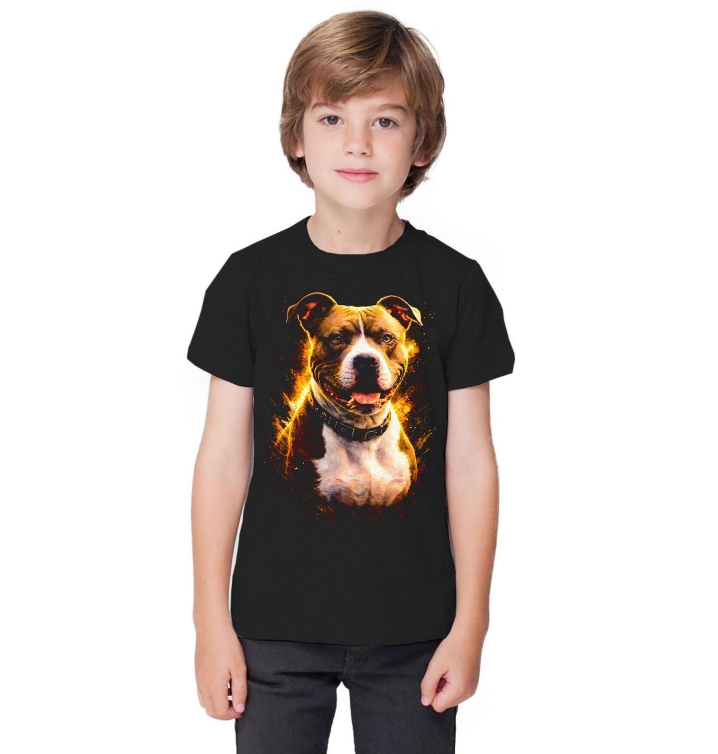 Dětské tričko Americký pitbulteriér. Tento výrazný motiv zachycuje sebevědomého psa plemene Americký pitbulteriér v dynamickém, zářivém stylu plném teplých barev. Detailní ilustrace zvýrazňuje svalnatou postavu, krátkou srst a přátelský, odhodlaný výraz, díky kterému je tento pes symbolem síly, věrnosti a odvahy. Americký pitbulteriér je inteligentní, energický a velmi oddaný pes, který miluje kontakt se svou rodinou.