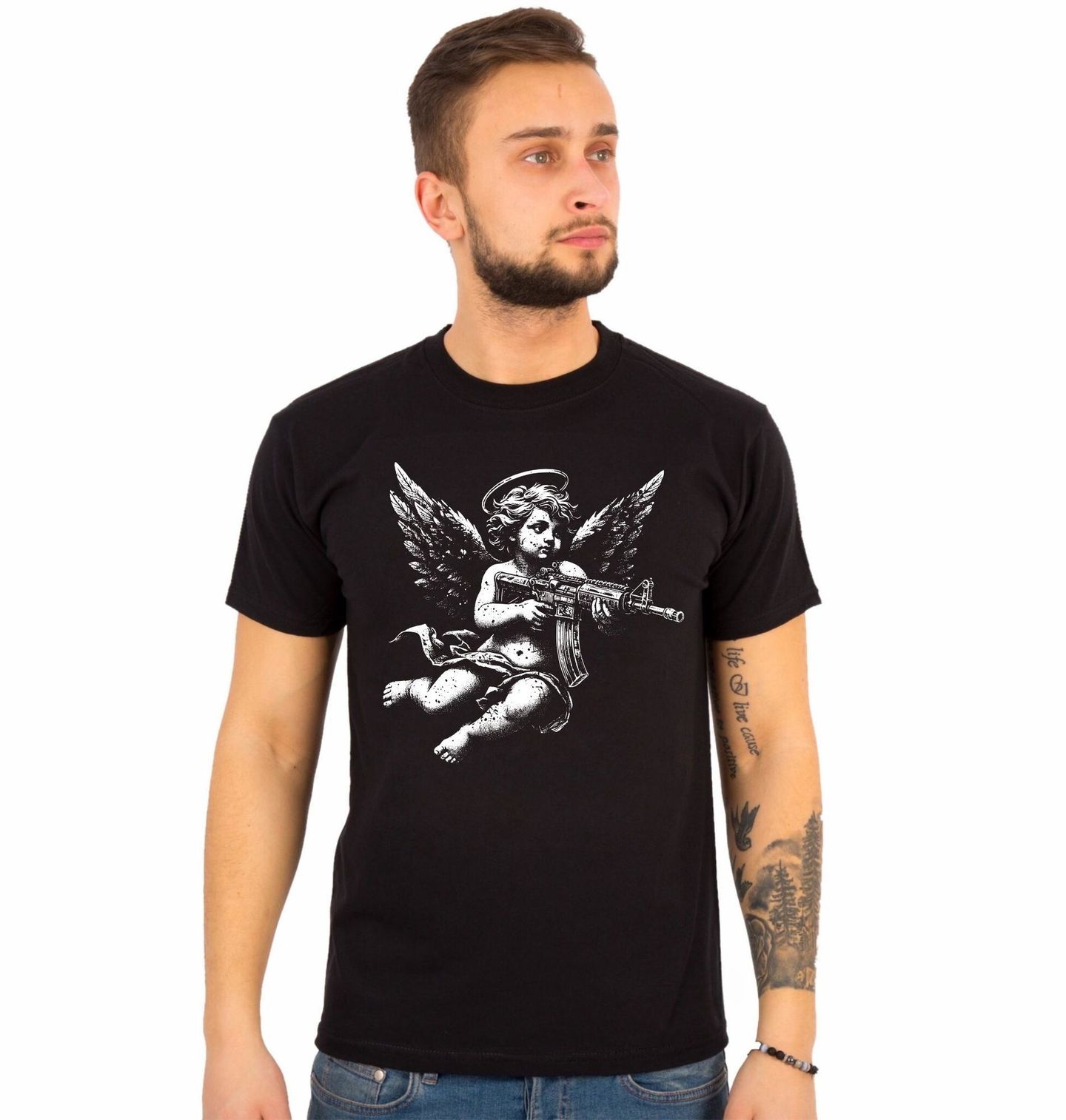 Pánské tričko Anděl Cupid s AK-47. Tento originální motiv spojuje nevinnost a rebelii v jedinečné parodii. Na ilustraci je anděl v retro stylu – inspirovaný mytologickou postavou Cupida – ale místo luku drží moderní zbraně, konkrétně útočnou pušku AK-47. Tenhle anděl rozhodně není jen sladký symbol – tahle parodie posouvá Cupid do úplně jiné roviny.
