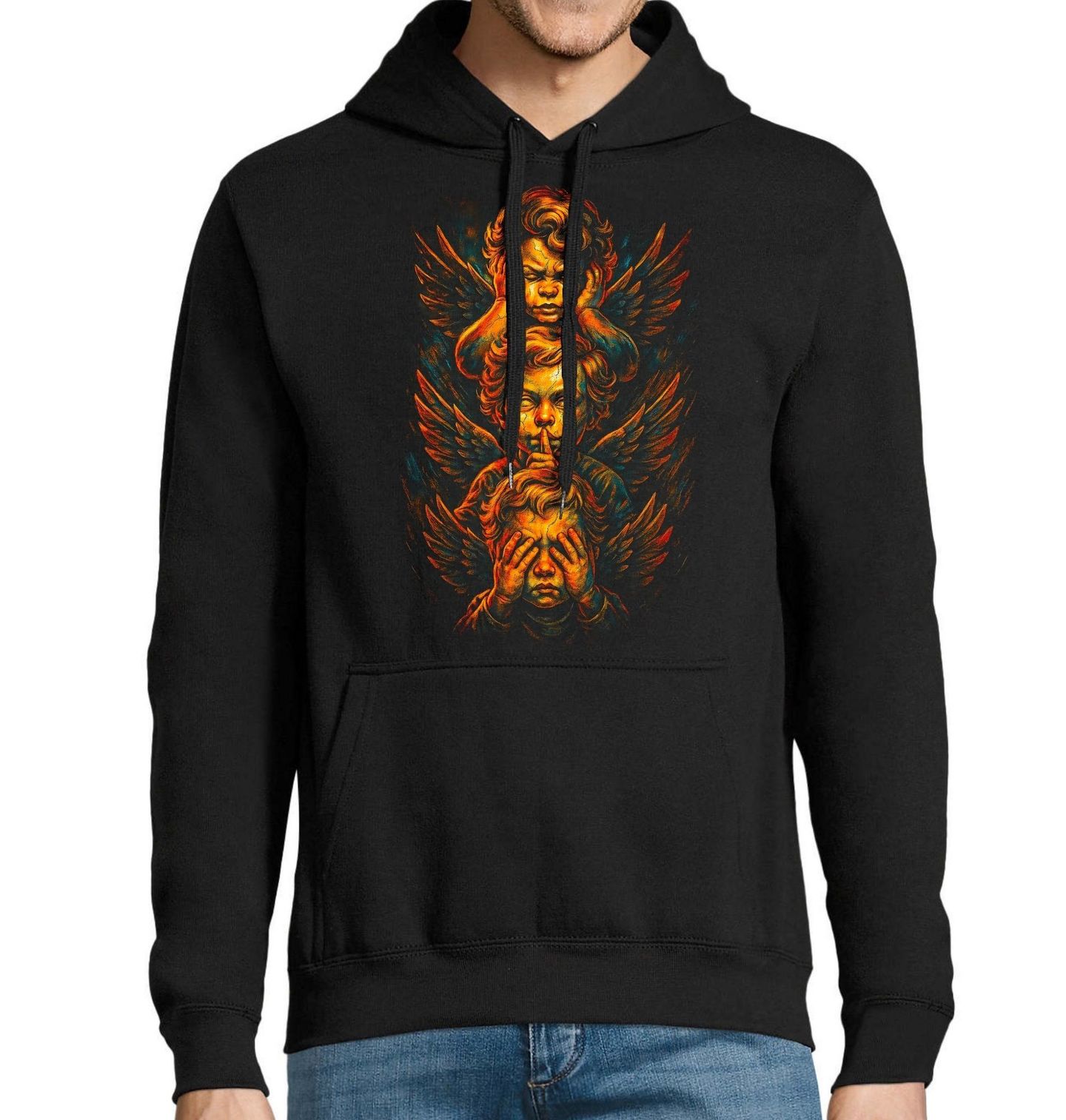 Pánská mikina Anděl Neslyším Zlo, Nemluvím Zlo, Nevidím Zlo. Originální a výrazný motiv inspirovaný známým symbolem „tři moudré opice“, který má své kořeny v buddhismu. Tento design však přináší temnější a moderní pojetí – místo opic zde vystupuje trojice postav jako anděl, ztvárněných ve stylu „nevidím, neslyším, nemluvím zlo“. Motiv funguje jako stylová parodie na tradiční buddhistický koncept, který vyjadřuje snahu nevnímat a nešířit negativitu.