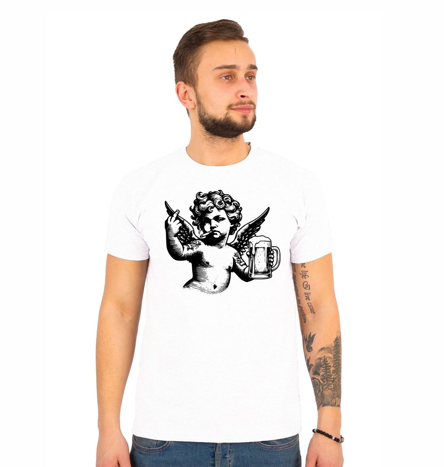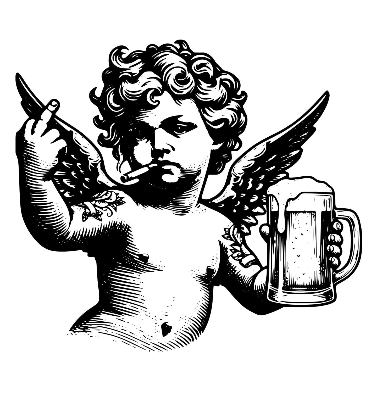 Pánské tričko Anděl s Pivem a Cigaretou. Originální design anděla v rebelujícím stylu spojuje klasickou sochařskou estetiku s moderním humorem. Anděl drží v jedné ruce pivo a v druhé cigaretu, což vytváří výrazný kontrast mezi nevinností a provokací.