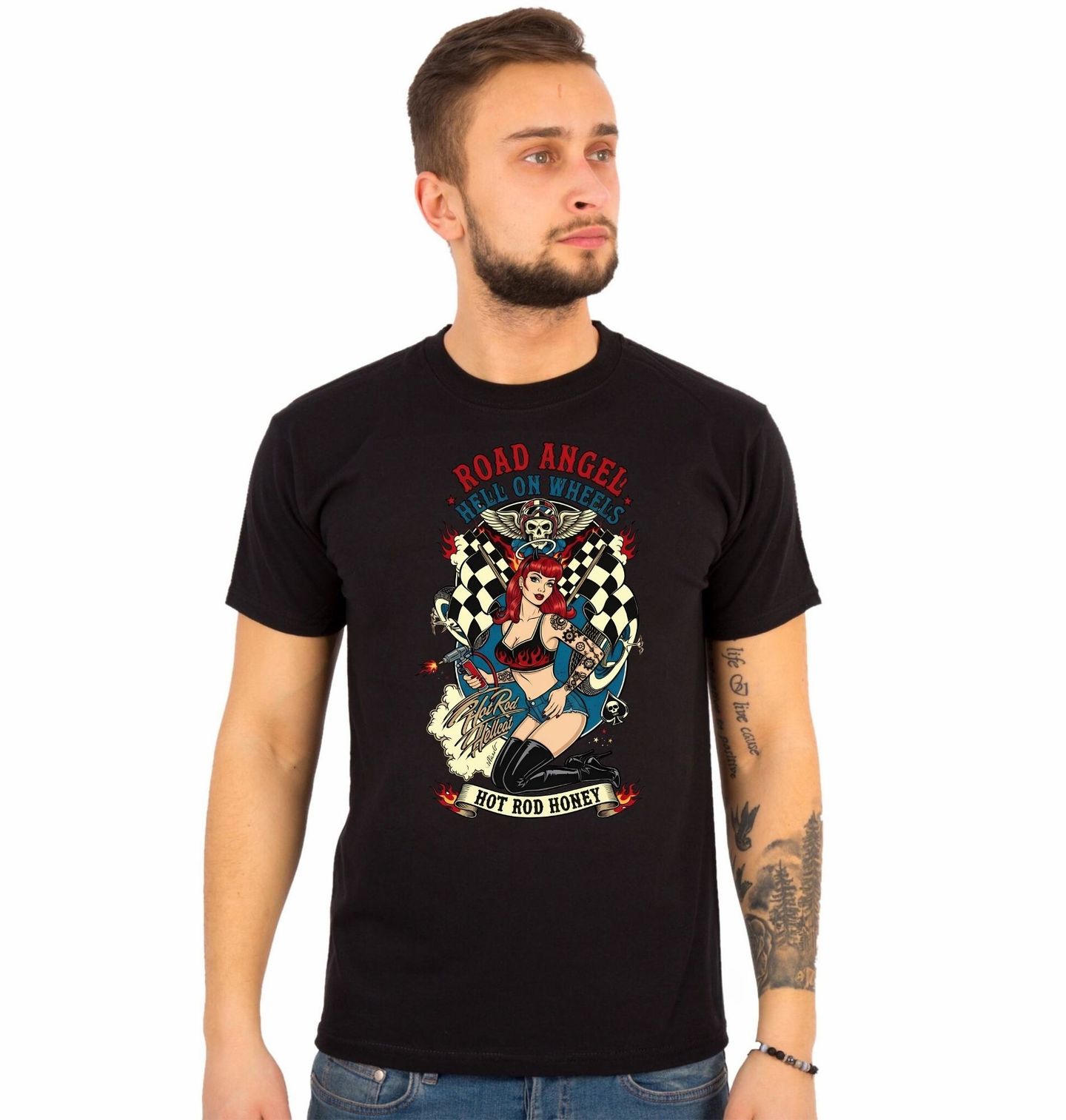 Pánské tričko Anděl Silnic Road Angel Hot Rod Honey. Design zobrazuje rebelku mezi závodními vlajkami a lebkou s křídly, což ocení každý motorkář, který miluje rychlost, oheň a stylové vintage ilustrace. Nápisy na motivu mají význam: „Road Angel“ = „anděl silnic“, „Hell on Wheels“ = „peklo na kolech“ a „Hot Rod Honey“ = „žhavá kráska z hot rod scény“. Ideální volba pro fanoušky motorek, americké garage kultury a výrazných potisků s oldschool atmosférou.