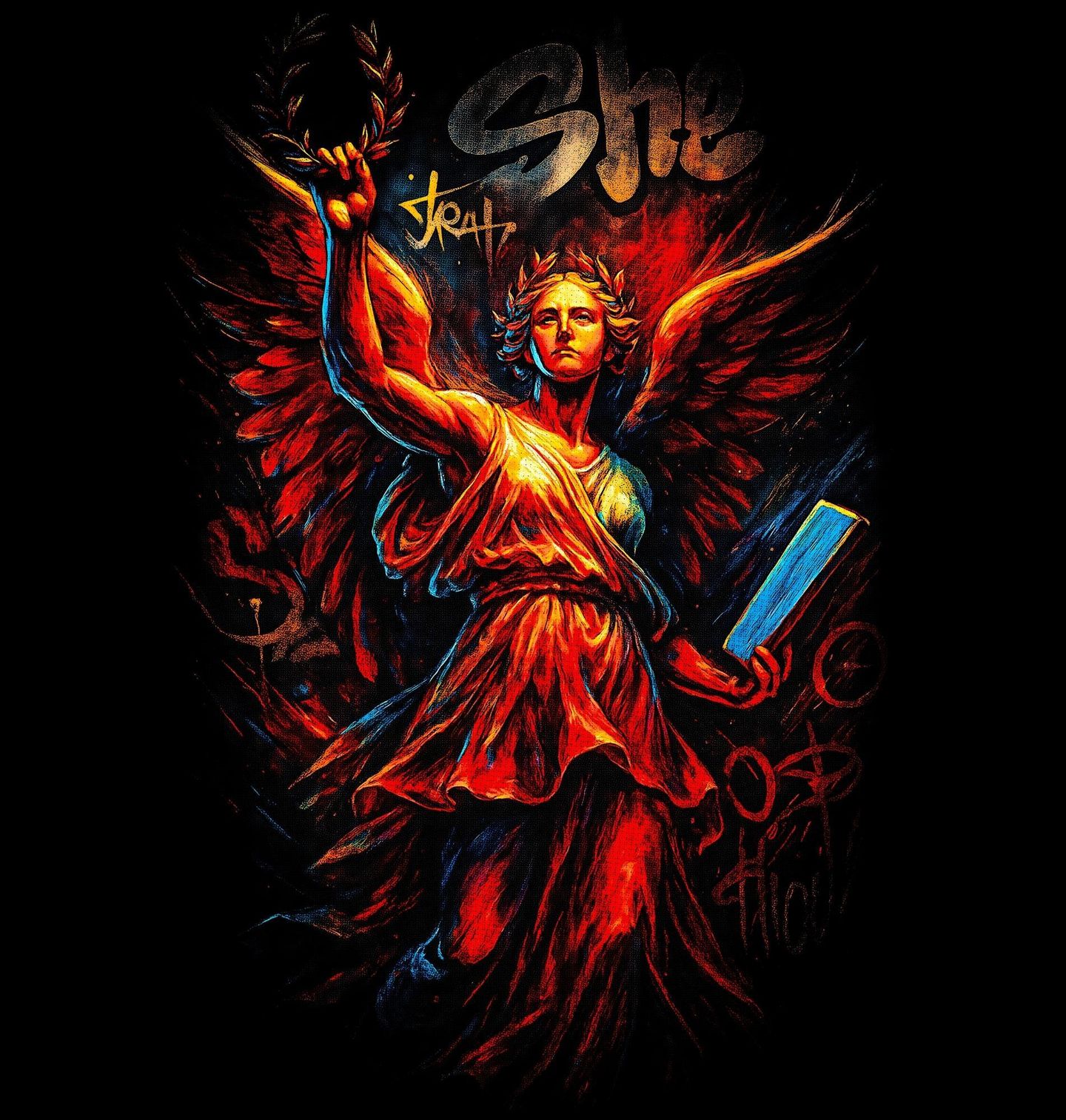 Pánské tričko Anděl Spravedlnosti. Silný a ikonický motiv zobrazuje okřídlenou postavu připomínající antickou bohyni nebo anděla, který v ruce drží vavřínový věnec vítězství a knihu poznání. Tento design symbolizuje spravedlnost, vítězství, moudrost a morální sílu. Postava působí majestátně a nadčasově, jako ochránce hodnot a pravdy. Kombinace klasické estetiky a moderního uměleckého stylu dává motivu jedinečný charakter, který zaujme na první pohled.
