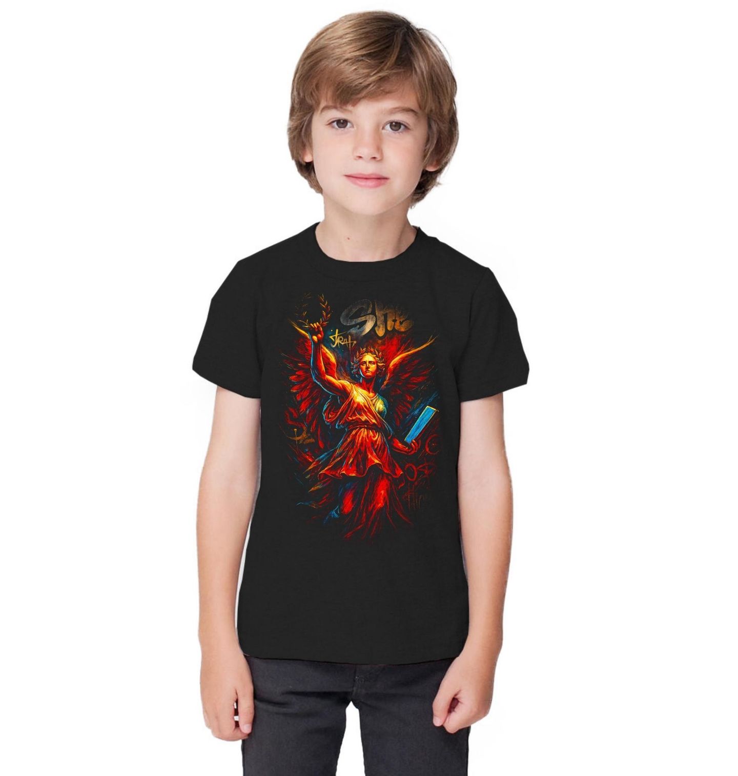 Dětské tričko Anděl Spravedlnosti. Silný a ikonický motiv zobrazuje okřídlenou postavu připomínající antickou bohyni nebo anděla, který v ruce drží vavřínový věnec vítězství a knihu poznání. Tento design symbolizuje spravedlnost, vítězství, moudrost a morální sílu. Postava působí majestátně a nadčasově, jako ochránce hodnot a pravdy. Kombinace klasické estetiky a moderního uměleckého stylu dává motivu jedinečný charakter, který zaujme na první pohled.