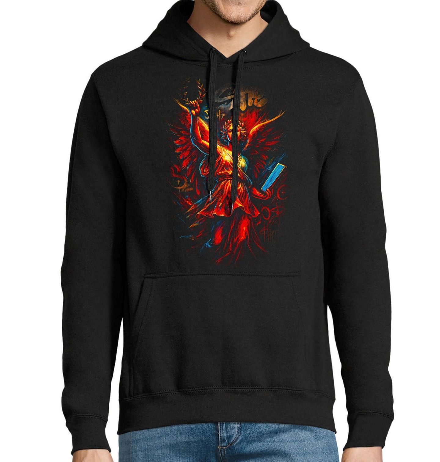 Pánská mikina Anděl Spravedlnosti. Silný a ikonický motiv zobrazuje okřídlenou postavu připomínající antickou bohyni nebo anděla, který v ruce drží vavřínový věnec vítězství a knihu poznání. Tento design symbolizuje spravedlnost, vítězství, moudrost a morální sílu. Postava působí majestátně a nadčasově, jako ochránce hodnot a pravdy. Kombinace klasické estetiky a moderního uměleckého stylu dává motivu jedinečný charakter, který zaujme na první pohled.
