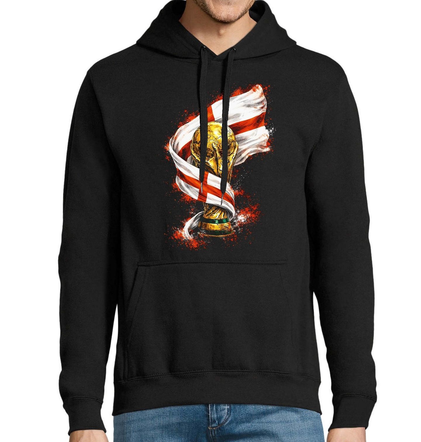 Pánská mikina Anglická Trofej FIFA World Cup. Výrazný motiv zobrazující slavnou trofej Mistrovství světa ve fotbale zahalenou do národní vlajky, která jasně odkazuje na zemi Anglie. Bílý podklad s červeným křížem, typický pro anglickou vlajku, dodává designu silný národní charakter a symbolizuje hrdost, tradici a vášeň pro fotbal, která je s touto zemí neodmyslitelně spjata.