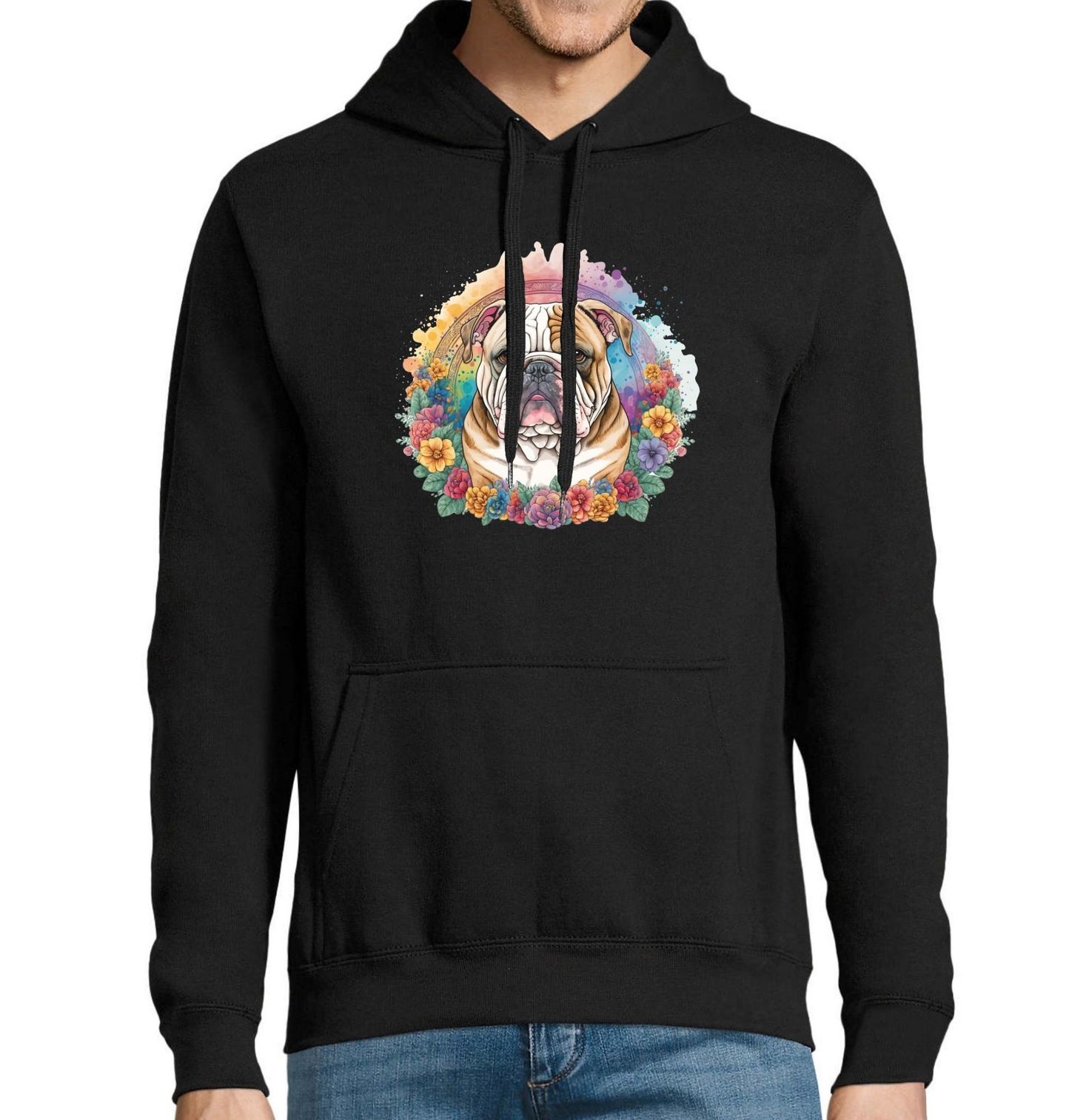 Pánská mikina Anglický buldok mezi Květinami. Tento motiv zachycuje typického představitele plemene – věrného, silného a srdnatého. Díky květinové kompozici získává ilustrace jemný kontrast, který potěší každého pejskaře. Ocení každý, kdo má rád, když pes vyjadřuje charakter i styl. Anglický buldok je zkrátka srdcař s noblesou.