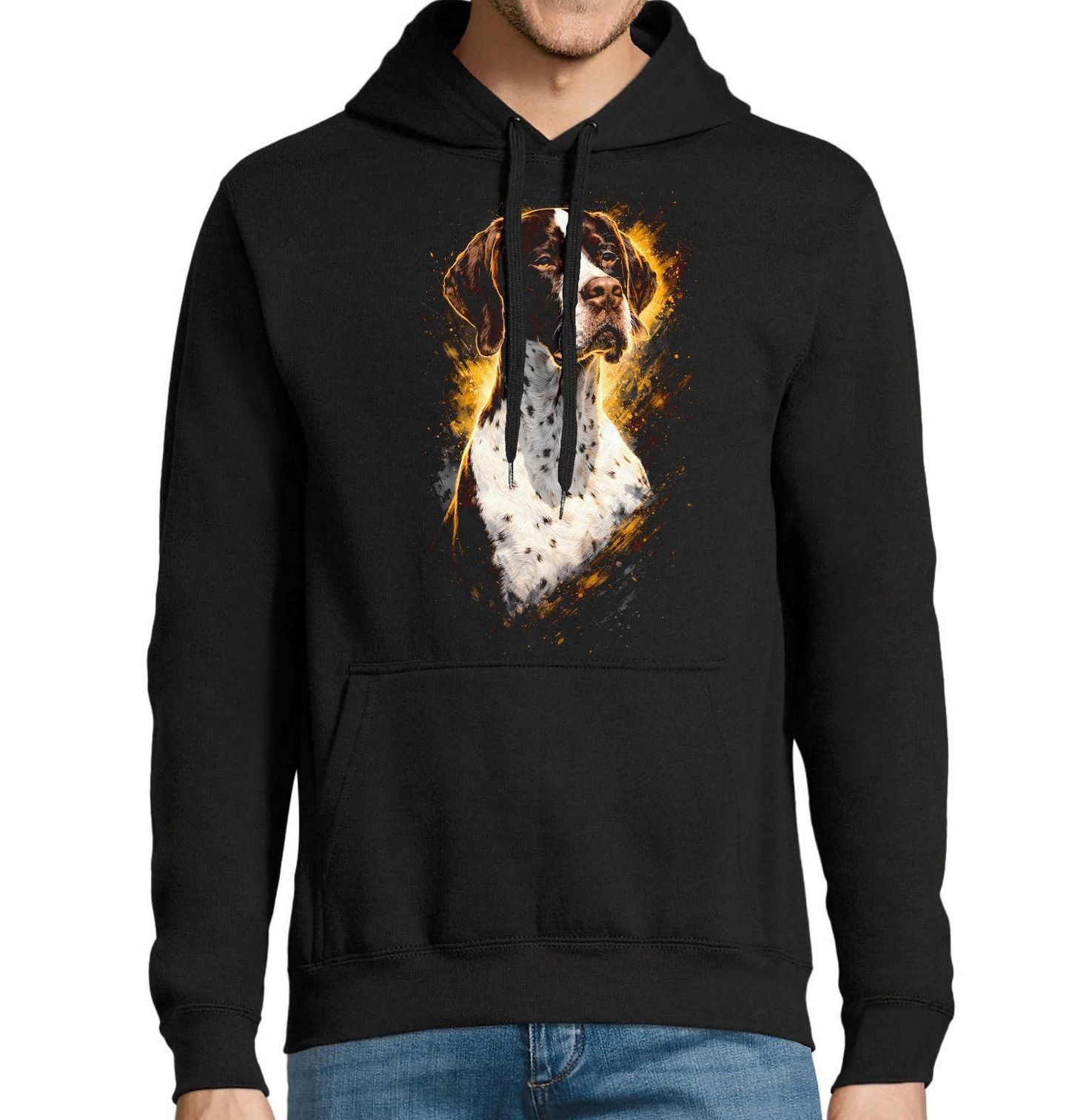 Pánská mikina Anglický Pointer. Tento ušlechtilý pes s typickým postojem a výrazným pohledem působí sebevědomě a soustředěně, jako pravý profesionál v terénu. Každý pejskař, který obdivuje lovecká plemena a aktivní psy, ocení detailní kresbu srsti i charakteristické zbarvení tohoto psa. Anglický pointer je pes, který vyniká svou inteligencí, energií a výborným čichem, což z něj dělá ideálního partnera pro pohyb i práci.