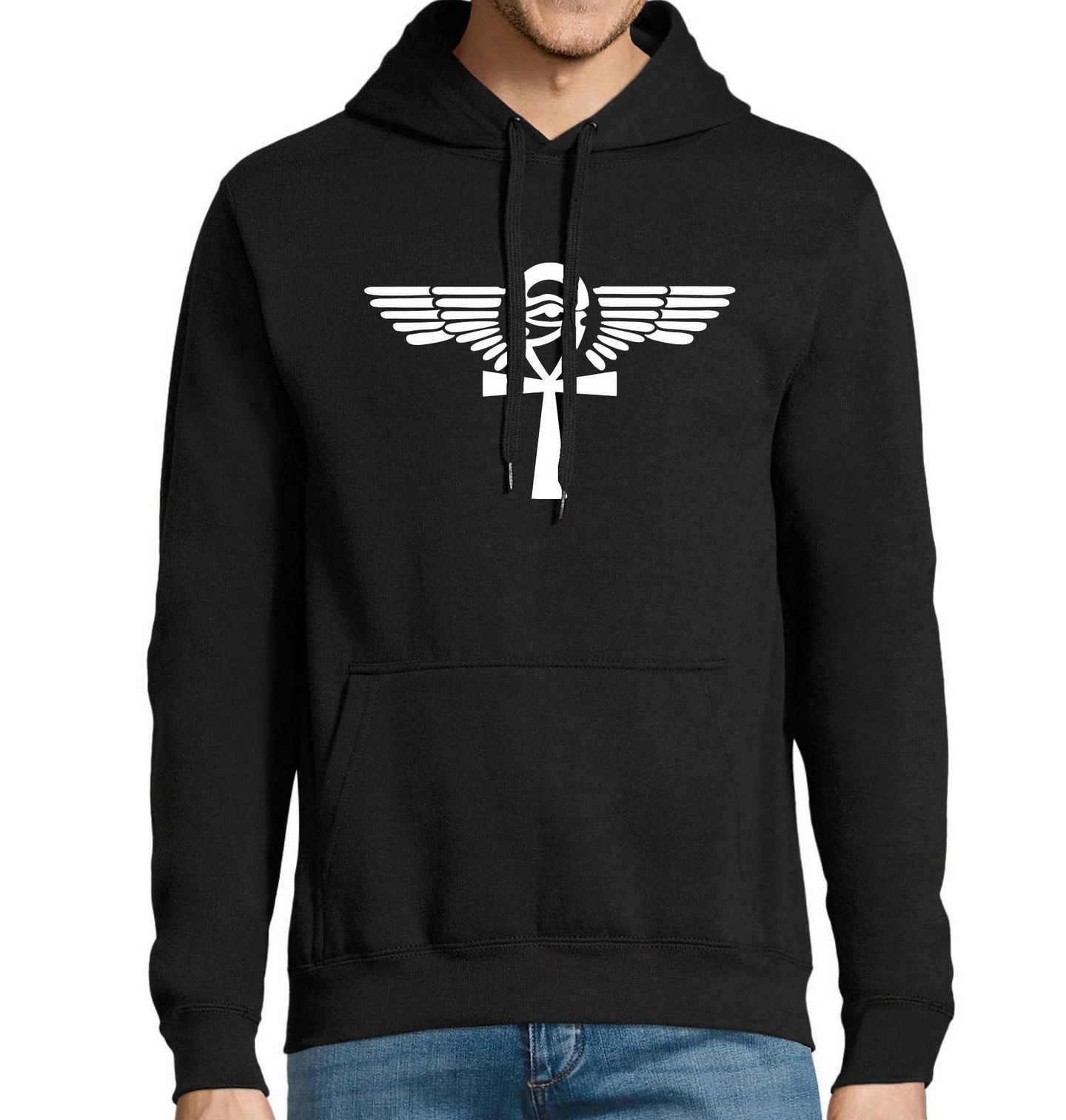 Pánská mikina Ankh Horovo oko. Egyptský symbol Vedžat – magické Oko Hora, které je zde propojeno s ankhem (symbol života) a křídly bohů. Motiv pochází z mytologie starověkého Egypta, kde se tyto symboly používaly v chrámovém umění, amuletech i hrobkách faraonů.