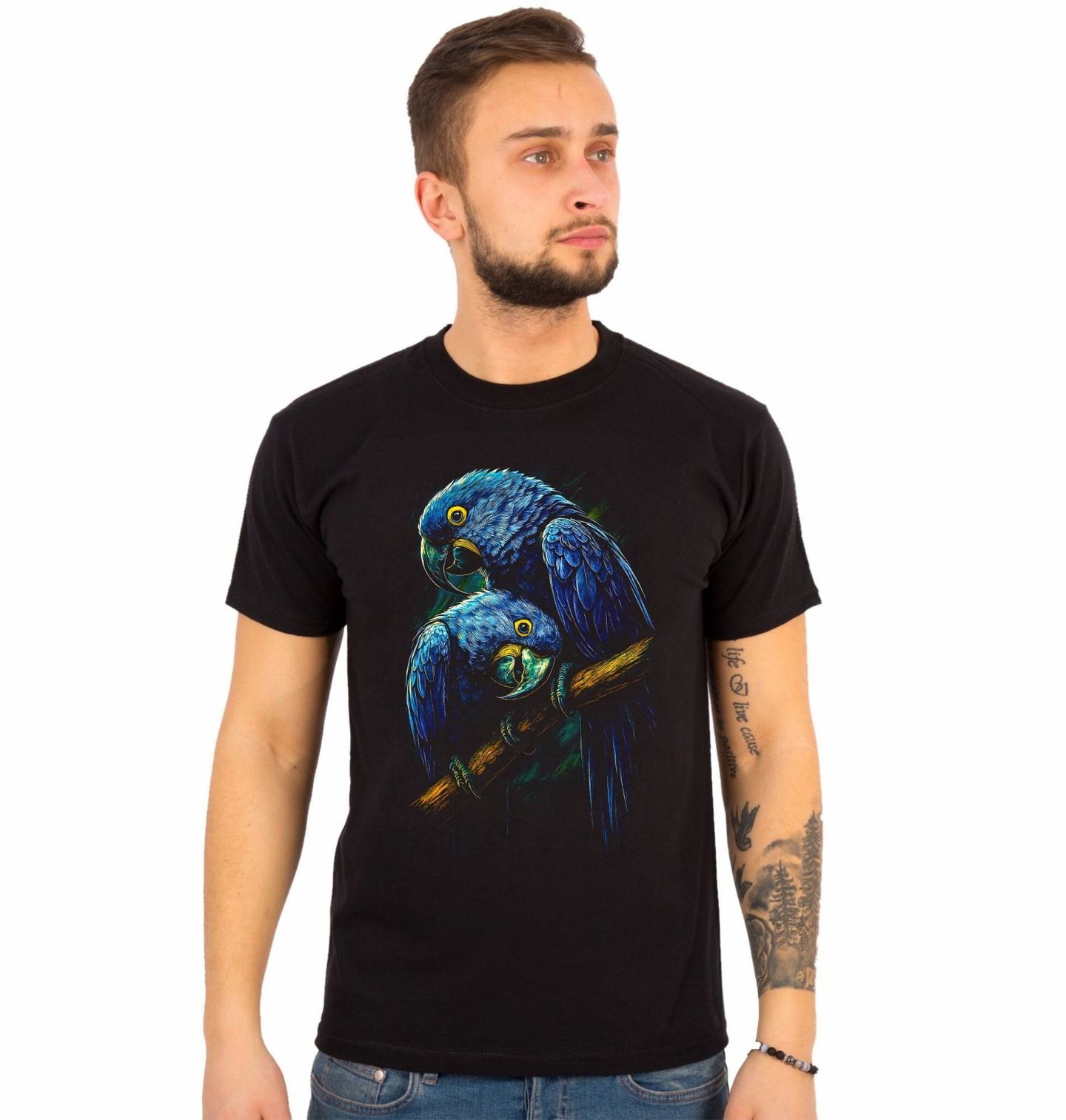 Pánské tričko Ara hyacintový v Páru. Papoušek ara hyacintový je symbolem síly, inteligence a celoživotního partnerství. Tento výjimečný pták patří mezi největší a nejvzácnější papoušky světa a je známý svým silným poutem ke svému partnerovi. Motiv dvou ar hyacintových zachycuje klid, důvěru a hluboké spojení, které je pro tento druh typické.