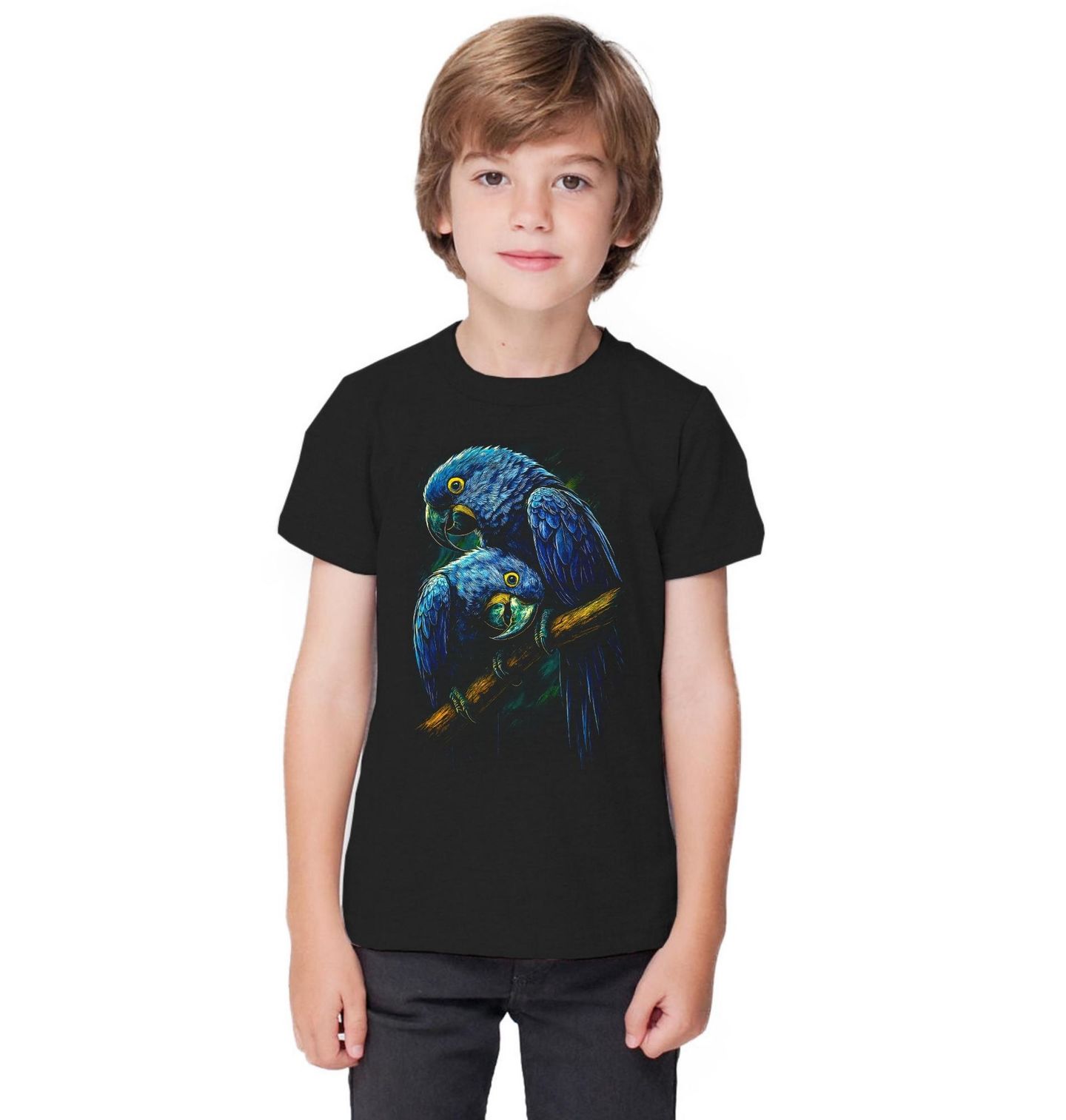 Dětské tričko Ara hyacintový v Páru. Papoušek ara hyacintový je symbolem síly, inteligence a celoživotního partnerství. Tento výjimečný pták patří mezi největší a nejvzácnější papoušky světa a je známý svým silným poutem ke svému partnerovi. Motiv dvou ar hyacintových zachycuje klid, důvěru a hluboké spojení, které je pro tento druh typické.