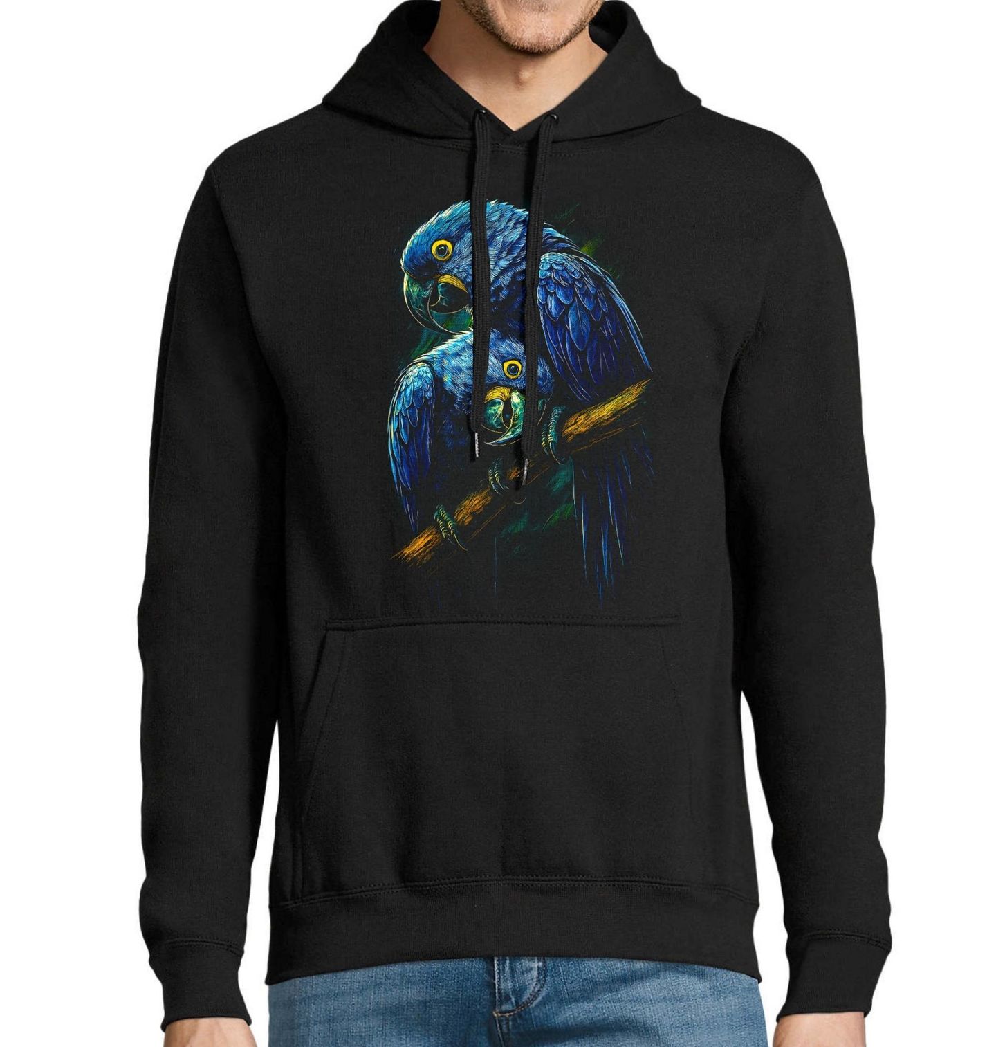 Pánská mikina Ara hyacintový v Páru. Papoušek ara hyacintový je symbolem síly, inteligence a celoživotního partnerství. Tento výjimečný pták patří mezi největší a nejvzácnější papoušky světa a je známý svým silným poutem ke svému partnerovi. Motiv dvou ar hyacintových zachycuje klid, důvěru a hluboké spojení, které je pro tento druh typické.