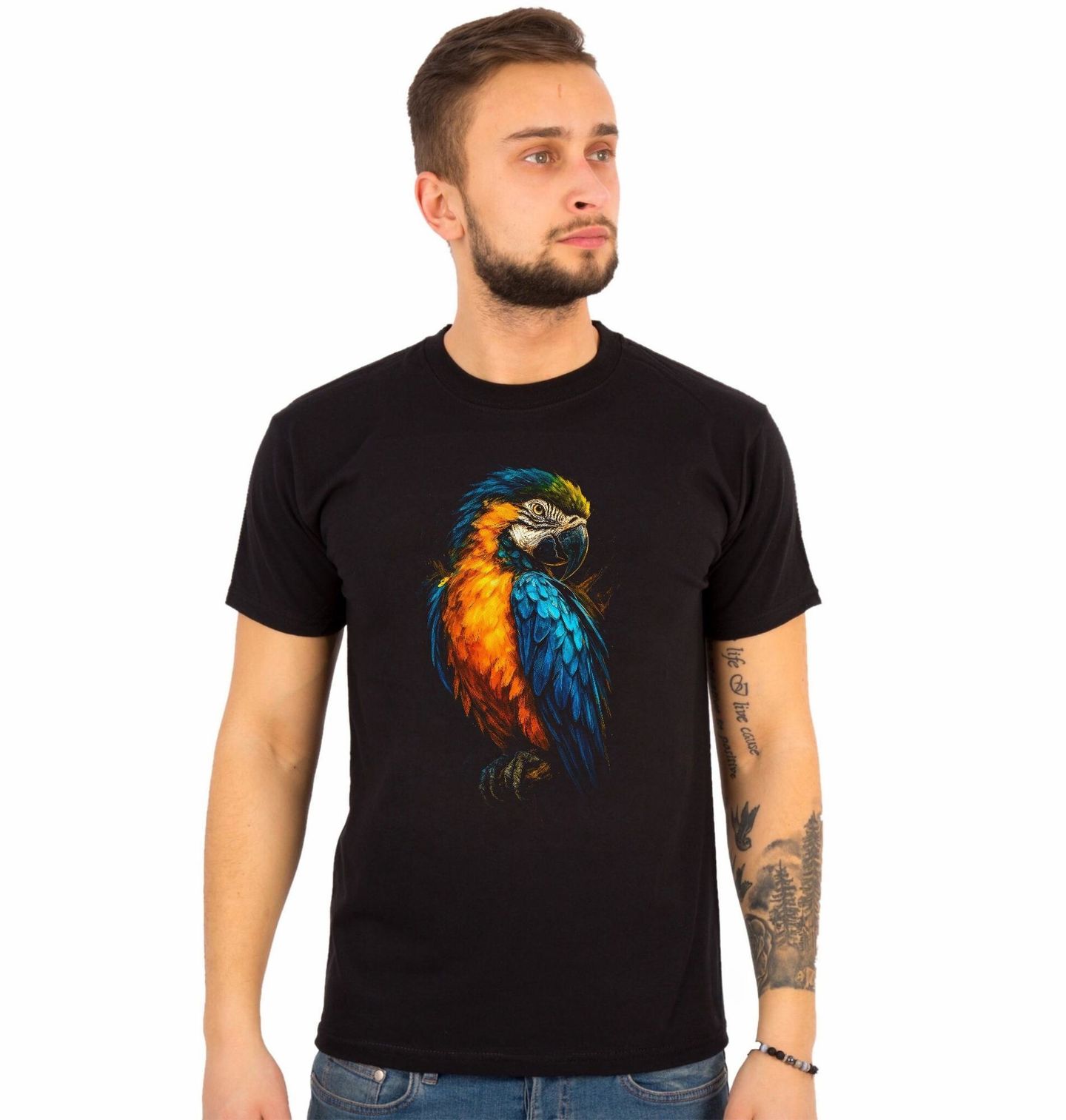 Pánské tričko Ara modrožlutý. Na ilustraci je papoušek Ara modrožlutý (Ara ararauna), majestátní pták známý svým sytě modrým peřím, zlatavě žlutým hrudníkem a inteligentním pohledem. Ara patří mezi nejikoničtější papoušky světa a symbolizuje svobodu, sílu a tropickou divokost.