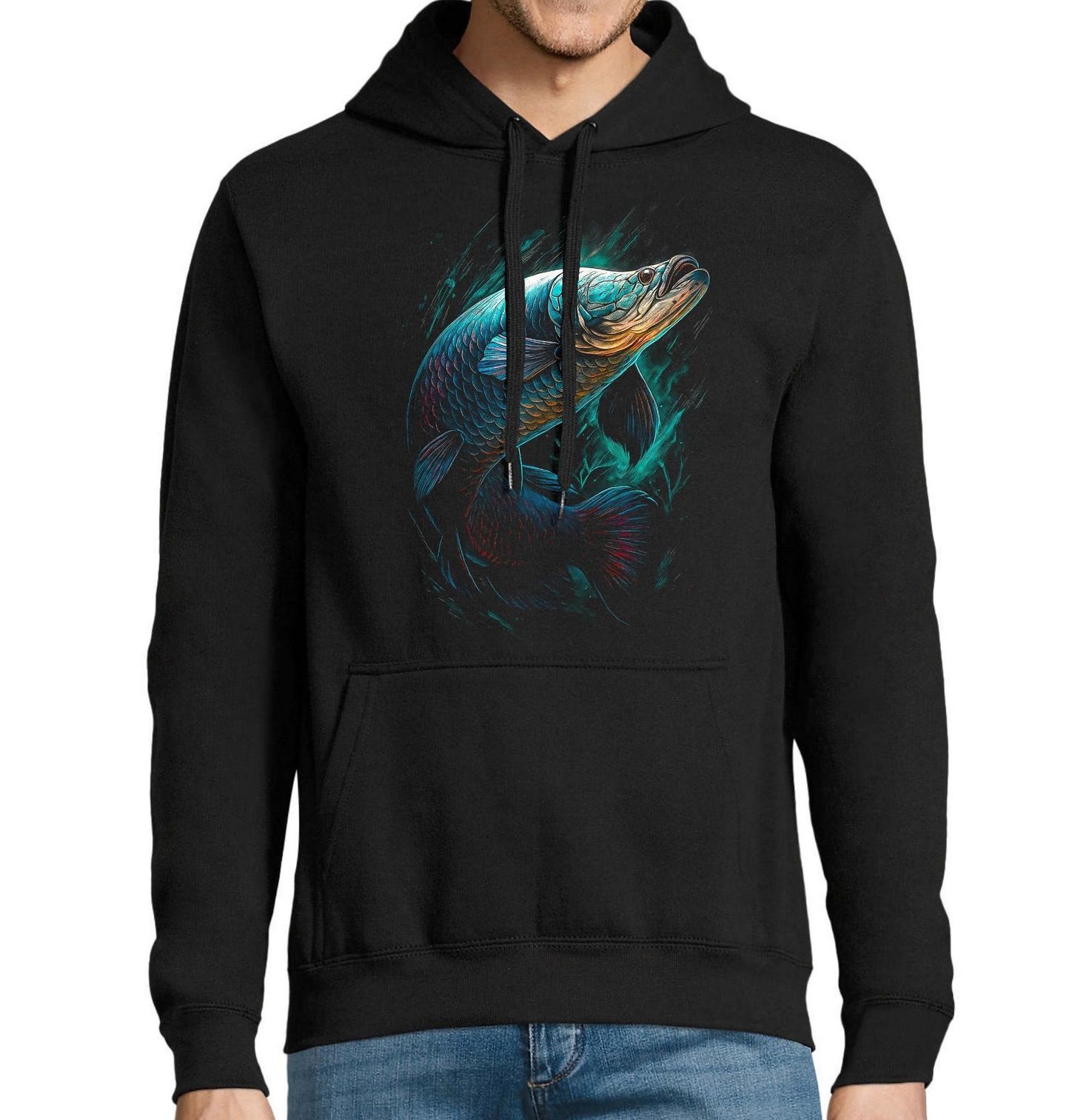 Pánská mikina Arapaima velká. Výrazný a majestátní motiv zobrazuje arapaima velkou (Arapaima gigas), jednu z největších sladkovodních ryb světa. Tento obraz dokonale vystihuje atmosféru, kterou rybaření přináší – trpělivost, soustředění a pokoru před skutečnými obry vod. Motiv je ideální volbou pro každého rybáře, který obdivuje exotické ryby.