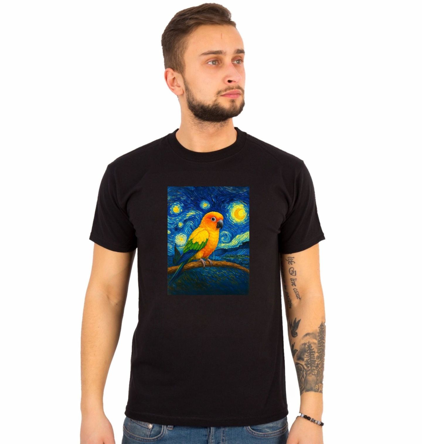 Pánské tričko Aratinga sluneční ve Hvězdné noci. Krásný a originální motiv, který spojuje slavný obraz Hvězdná noc a malířský styl Vincenta van Gogha s exotickou krásou barevného ptáka. Na větvi tu sedí papoušek – arapapoušek sluneční (Sun Conure), jehož zářivé barvy nádherně kontrastují s temně modrou noční oblohou.