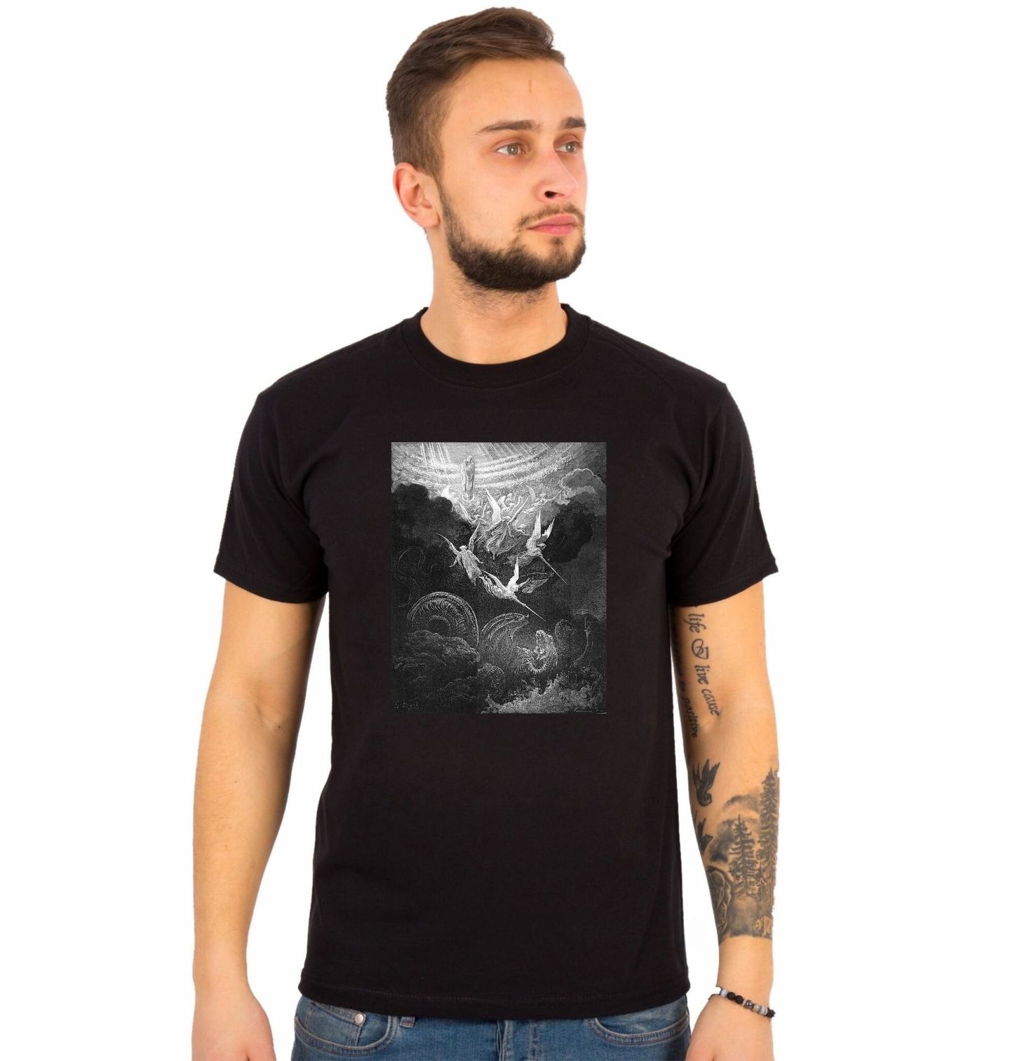 Pánské tričko Archanděl Michael Bojuje s Drakem The Crowned Virgin. Motiv pochází od francouzského umělce Gustava Dorého, ale inspiruje se „The Crowned Virgin“. Na motivu je Archanděl Michael a jeho andělé bojují s drakem. Zobrazuje biblickou scénu ze Zjevení sv. Jana, kde archanděl Michael vede nebeské vojsko proti drakovi — symbolu zla.