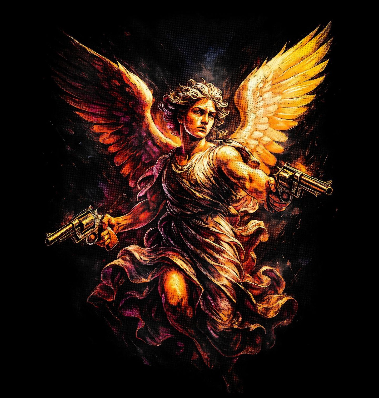 Pánské tričko Archanděl Michael s Revolvery. Archanděl Michael je jeden z nejznámějších andělů v křesťanství, je považován za bojovníka proti zlu a ďáblu, často bývá zobrazován, jak poráží Satana (draka nebo démona), je symbolem spravedlnosti, ochrany a boje za dobro. Ta zbraň, kterou ten anděl drží, je revolver, Konkrétně jde o styl klasického šestiranného revolveru (typicky ve stylu „western“ nebo policejních modelů).