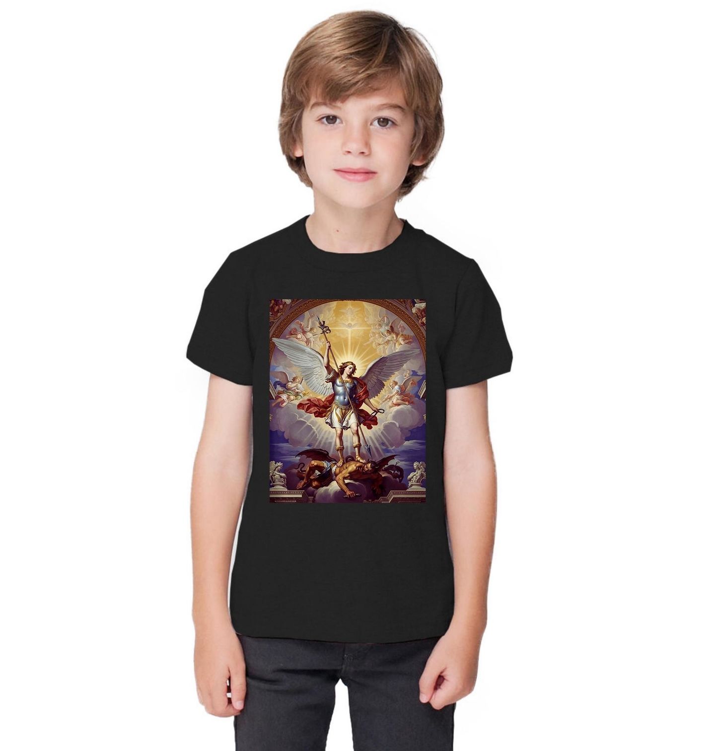 Dětské tričko Archanděl Michael Vyhrává nad Satanem. Mocný biblický výjev, ve kterém svatý archanděl Michael stojí jako neohrožený bojovník světla a spravedlnosti. S mečem a křídly zářícími v nebeském světle přemáhá Satana, symbol temnoty a zla. Archanděl Michael je patronem bojovníků, ochránců a těch, kteří brání pravdu.