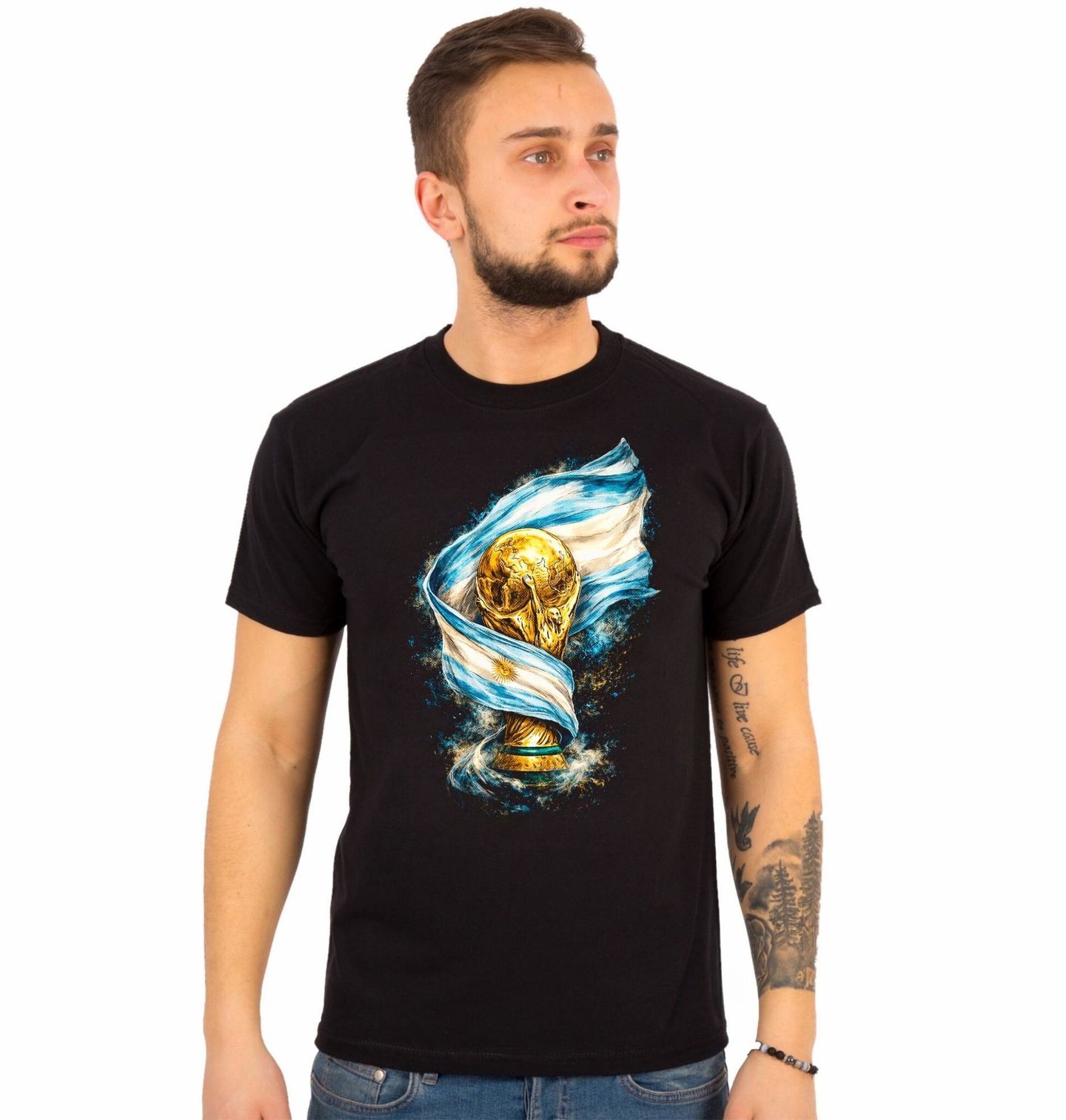 Pánské tričko Argentinská Trofej FIFA World Cup. Tento působivý motiv zobrazuje ikonickou trofej Mistrovství světa ve fotbale zahalenou do národní vlajky Argentiny. Jedná se o symbol nejvyššího fotbalového triumfu, který patří týmu z země Argentina. Zlatý pohár reprezentuje vítězství, hrdost a vášeň pro fotbal, zatímco argentinská vlajka dodává designu jedinečný národní charakter. Argentina ji získala naposledy v roce 2022.