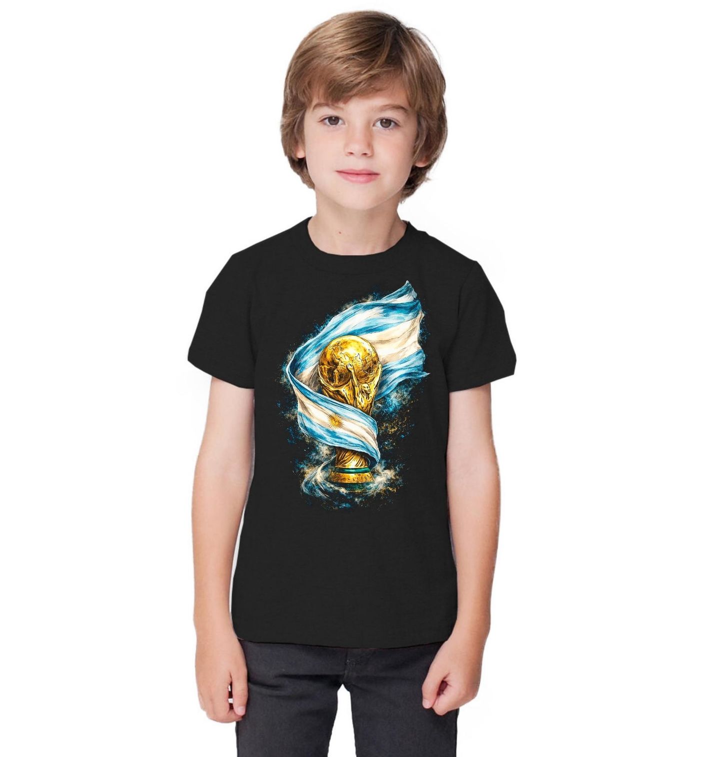 Dětské tričko Argentinská Trofej FIFA World Cup. Tento působivý motiv zobrazuje ikonickou trofej Mistrovství světa ve fotbale zahalenou do národní vlajky Argentiny. Jedná se o symbol nejvyššího fotbalového triumfu, který patří týmu z země Argentina. Zlatý pohár reprezentuje vítězství, hrdost a vášeň pro fotbal, zatímco argentinská vlajka dodává designu jedinečný národní charakter. Argentina ji získala naposledy v roce 2022.