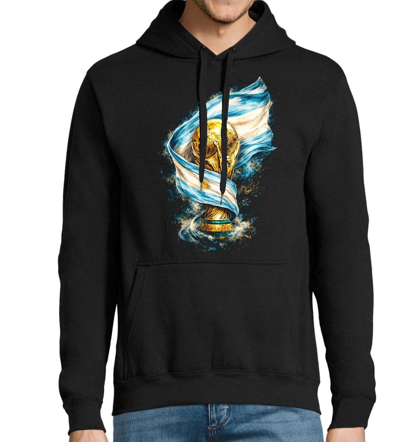 Pánská mikina Argentinská Trofej FIFA World Cup. Tento působivý motiv zobrazuje ikonickou trofej Mistrovství světa ve fotbale zahalenou do národní vlajky Argentiny. Jedná se o symbol nejvyššího fotbalového triumfu, který patří týmu z země Argentina. Zlatý pohár reprezentuje vítězství, hrdost a vášeň pro fotbal, zatímco argentinská vlajka dodává designu jedinečný národní charakter. Argentina ji získala naposledy v roce 2022.
