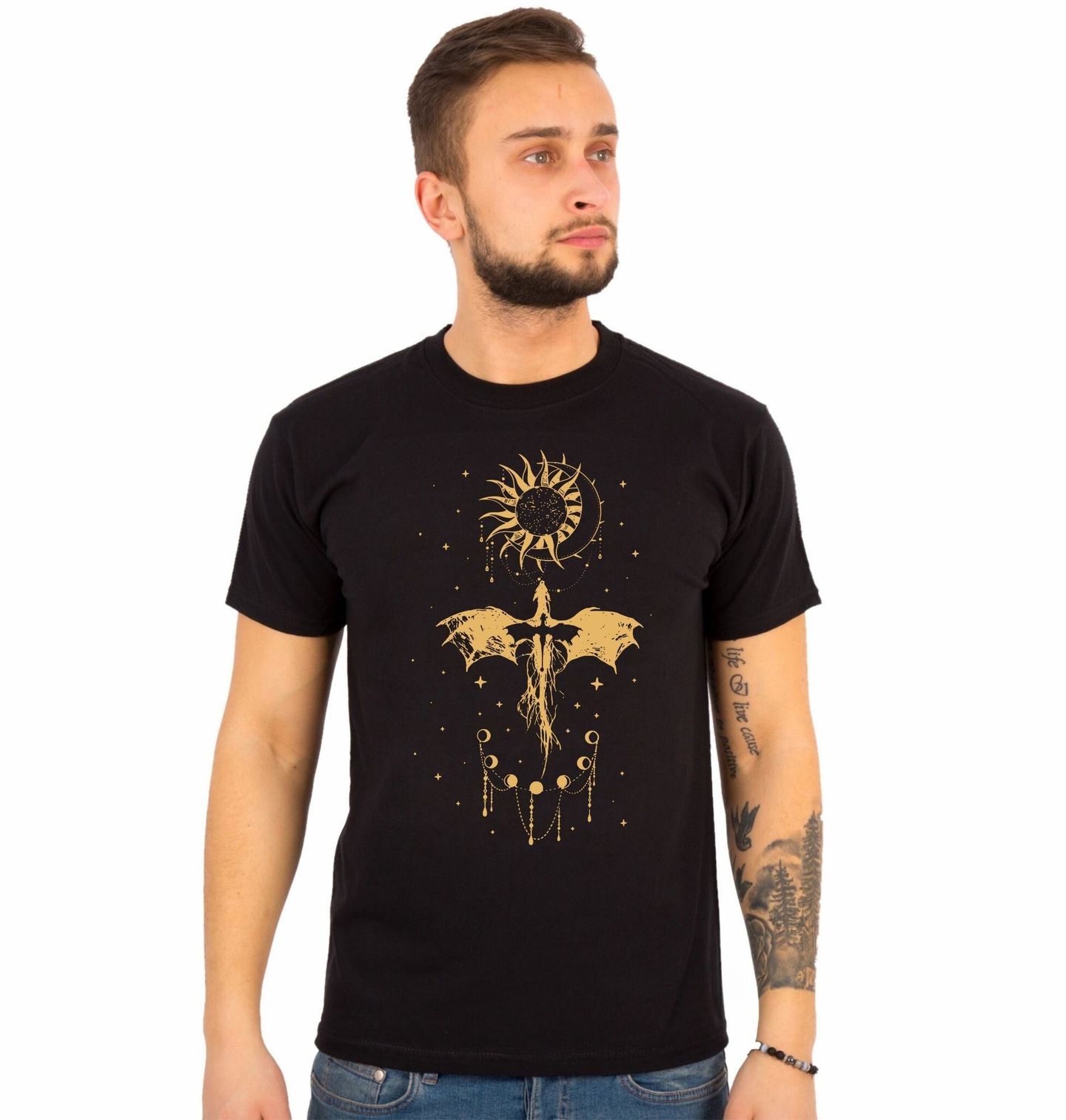 Pánské tričko Astrální Drak Měsíce. Tajemný a stylový motiv, který propojuje sílu tří symbolů – drak, slunce a měsíc. V centru designu dominuje silueta majestátního draka, vzlétajícího směrem k nebesům, obklopeného fázemi měsíce a zdobeného sluneční aurou.