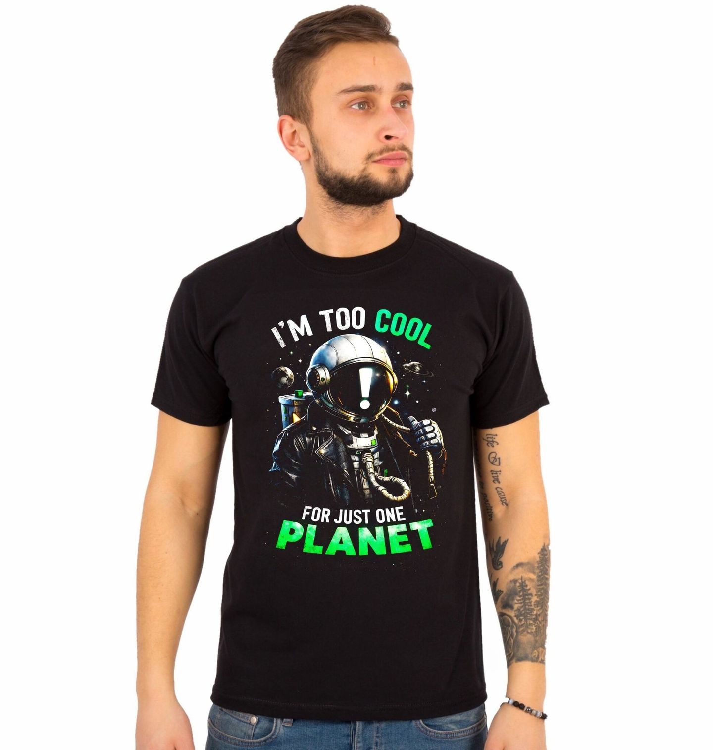 Pánské tričko Astronaut Jsem až moc cool jen pro jednu planetu. “I’m too cool for just one planet”. Originální motiv zobrazuje stylového astronaut, který si razí vlastní cestu napříč nekonečným vesmír. V kožené bundě a s výrazem absolutního klidu působí jako rebel mezi hvězdami – někdo, kdo se nevejde do běžných pravidel jedné planety. Vesmír v pozadí, planety a hvězdy dotváří atmosféru svobody, nadhledu a nekonečných možností.